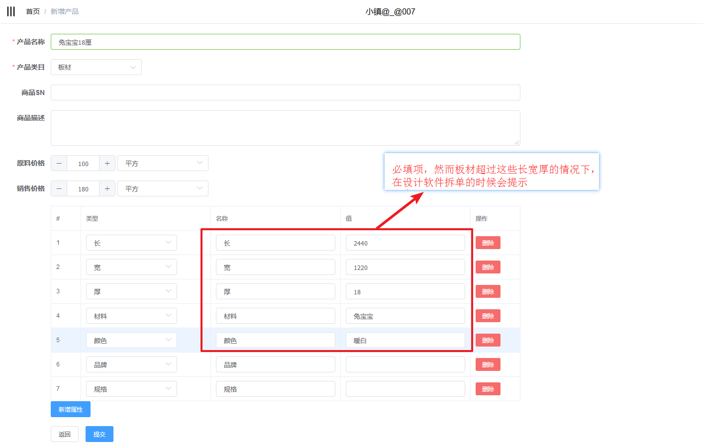 编辑产品名称,商品SN和商品描述;选择产品类目和商品类型;确定原料价格和销售价格;输入属性值,用户也可对属性进行删除和新增,填写完信息后,点击提交,该产品新增完成