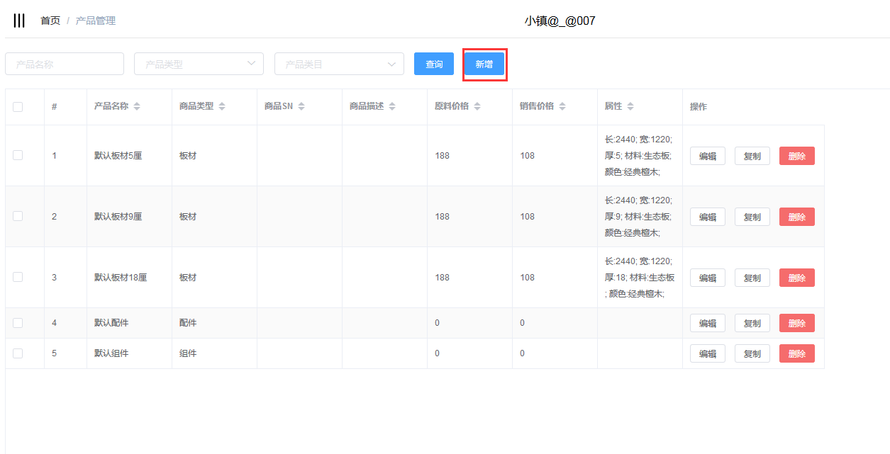 产品管理界面中系统默认组件和系统默认配件数据建议不要删除
