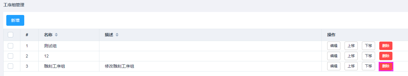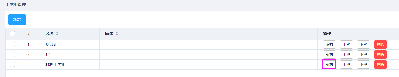 编辑工序组内容,“名称”,“描述”,“工序列表”,编辑完成后,点击“提交”,数据保存在工序组管理界面;