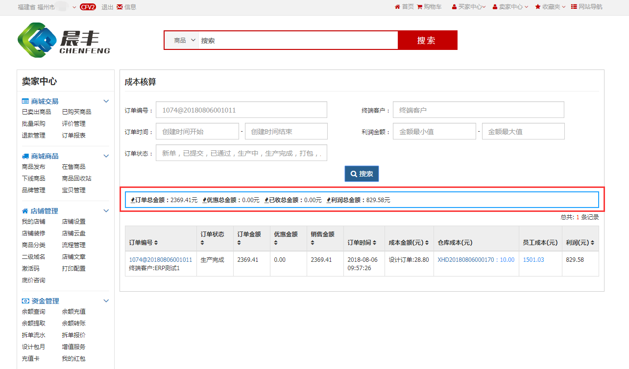 对于erp订单,我们都可对其进行成本核算显示,方便客户进行订单利润查询,成本核算显示的是未取消及未作废的订单,点击卖家中心-erp中心-成本核算,进入成本核算界面