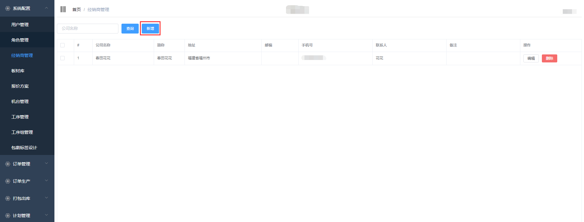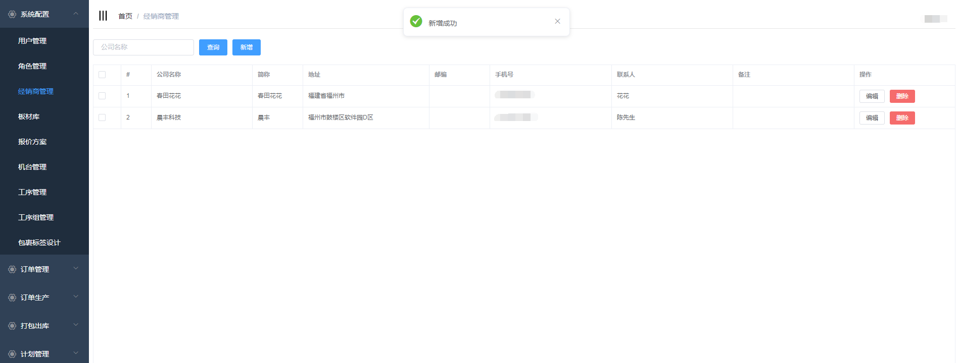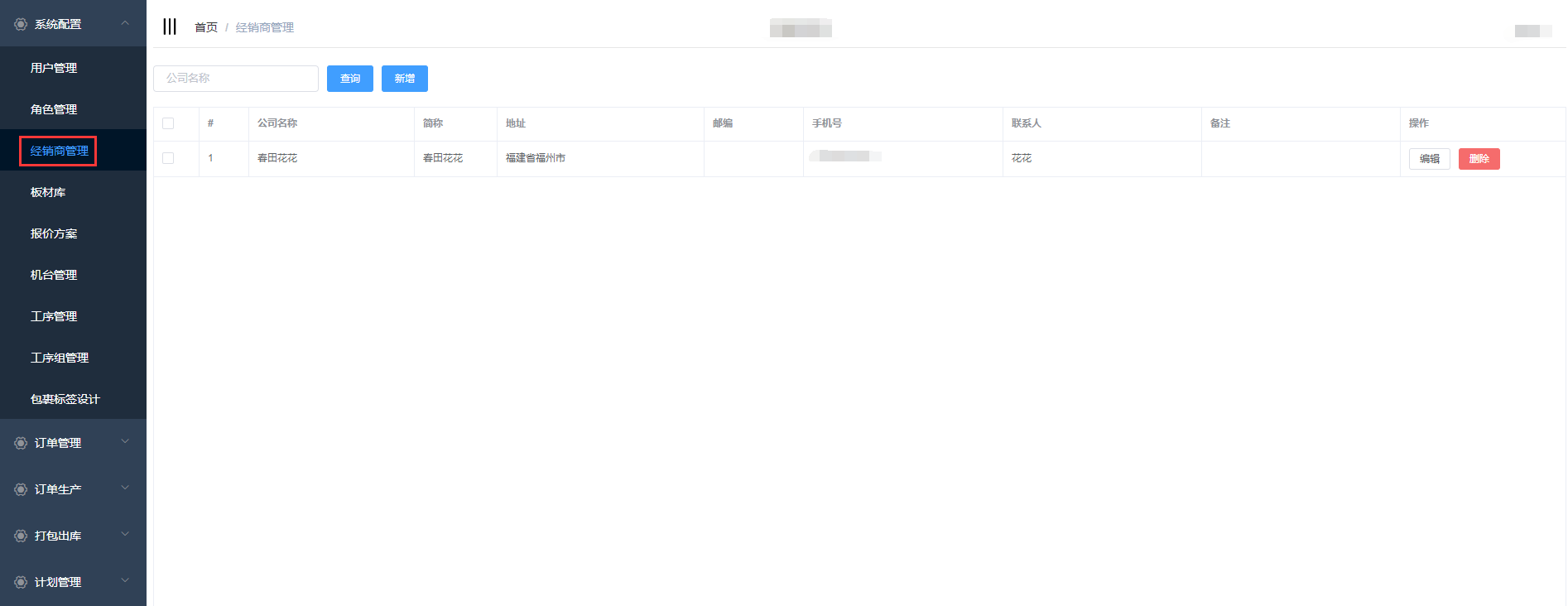 经销商管理是对系统的经销商信息进行管理:新增、编辑、删除;用户在新增订单时可以选择相应的经销商