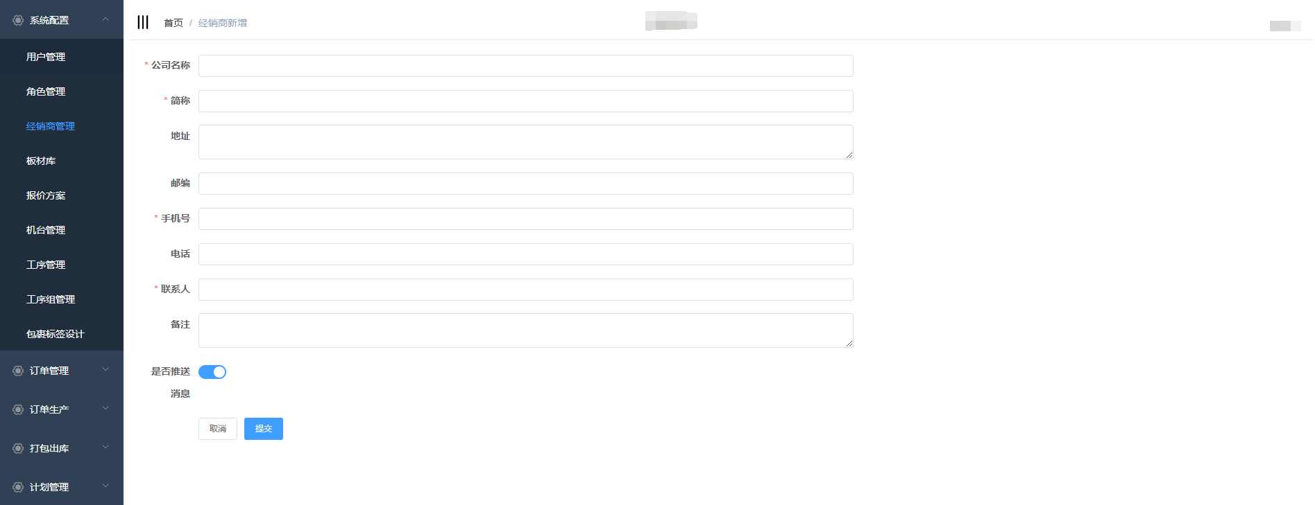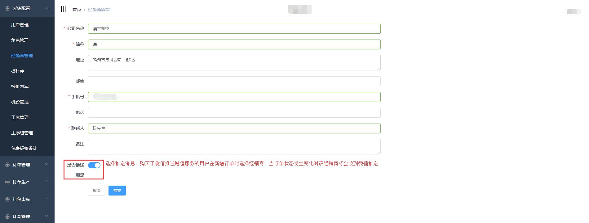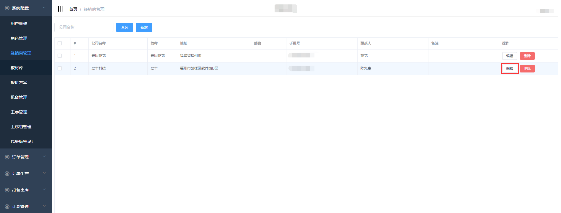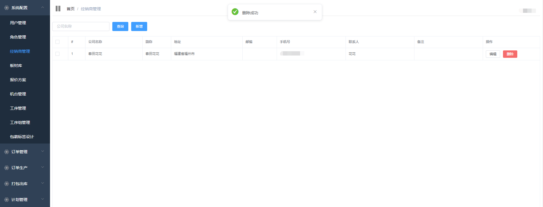 经销商管理是对系统的经销商信息进行管理:新增、编辑、删除;用户在新增订单时可以选择相应的经销商