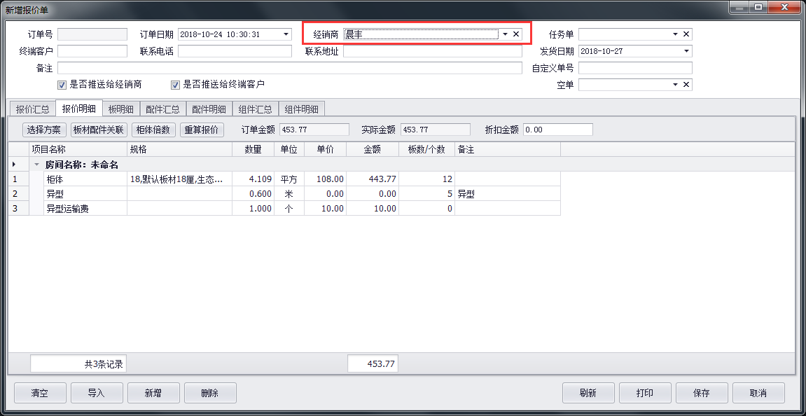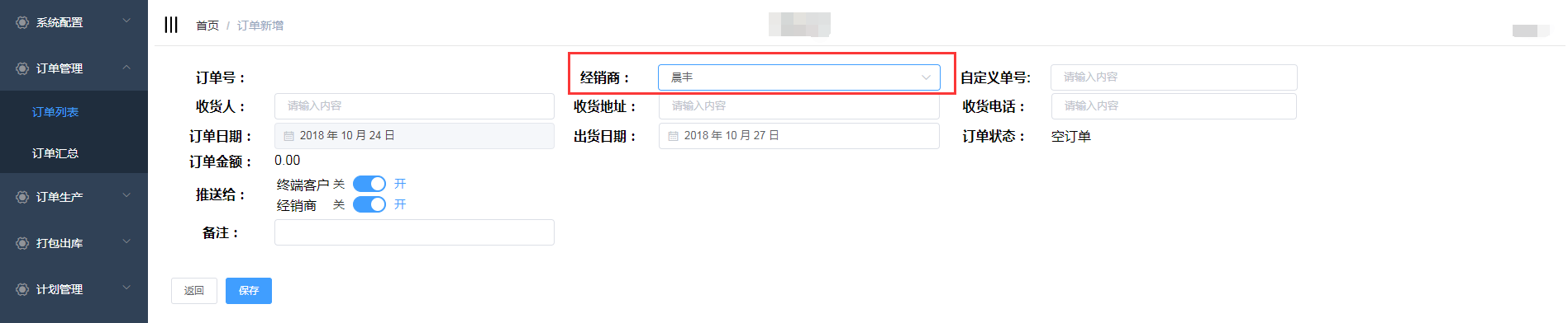 在订单管理的新增订单页面也可进行选择经销商