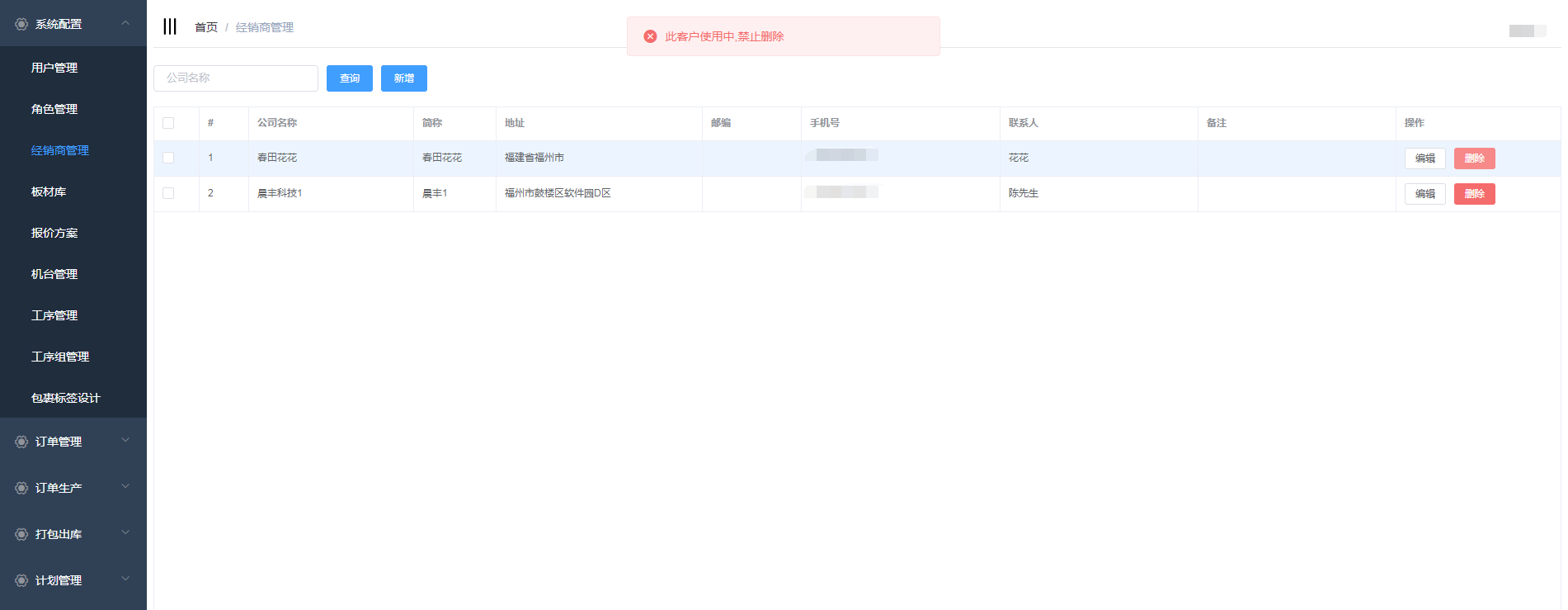 如果被删除的经销商正在订单中被使用则系统会提示‘此客户使用中,禁止删除'