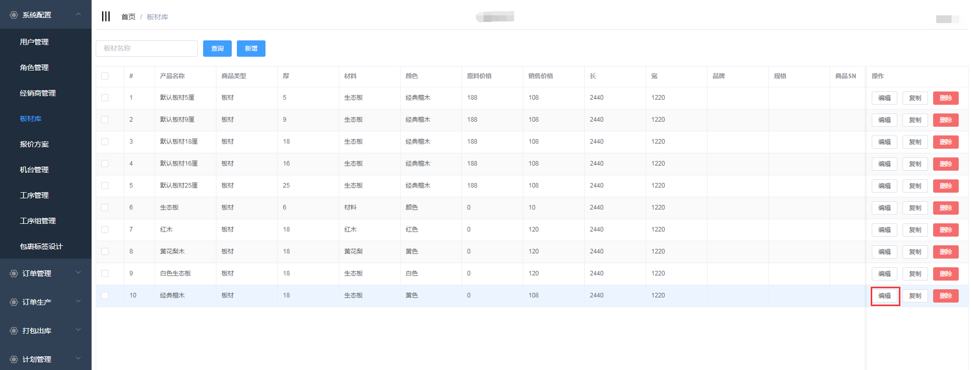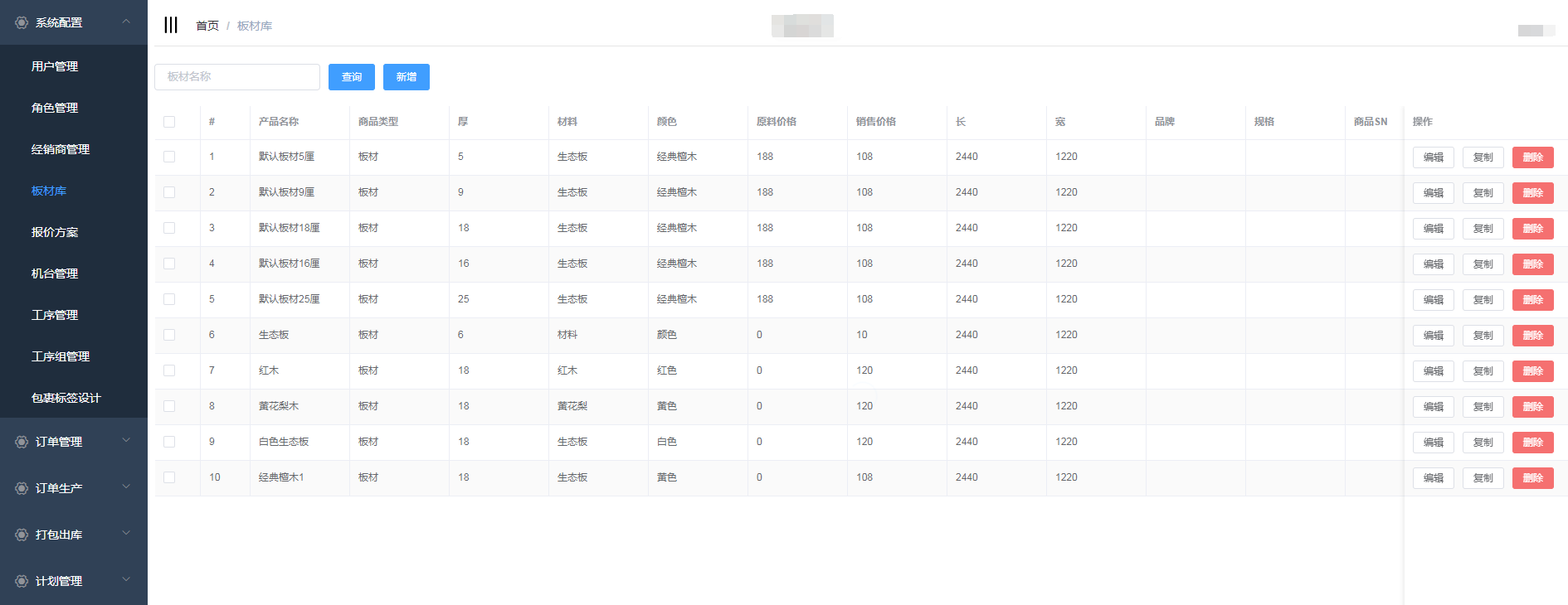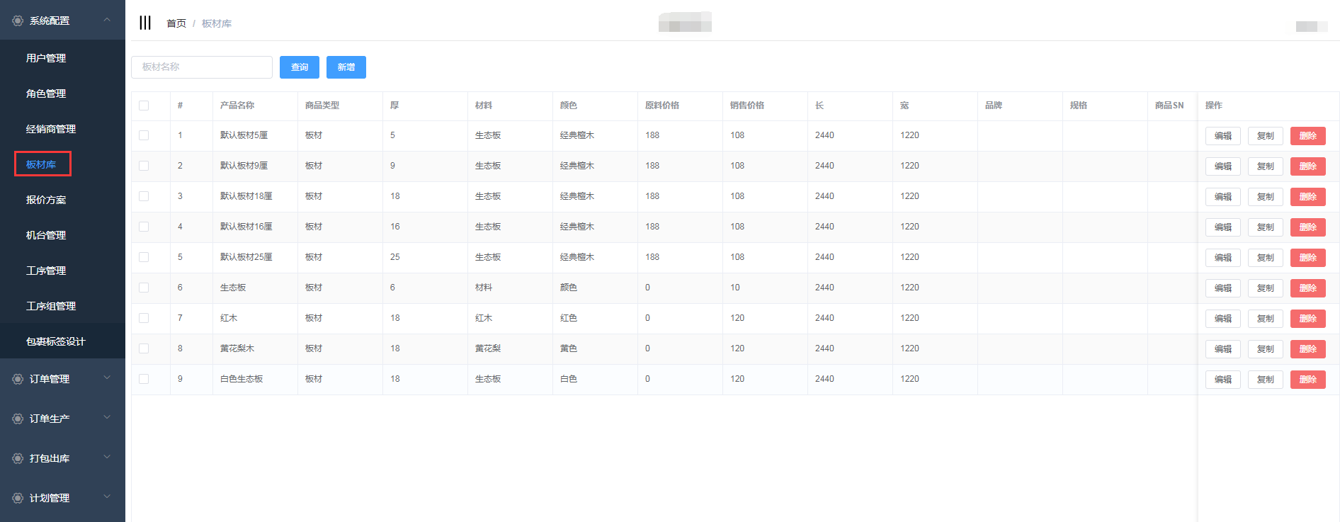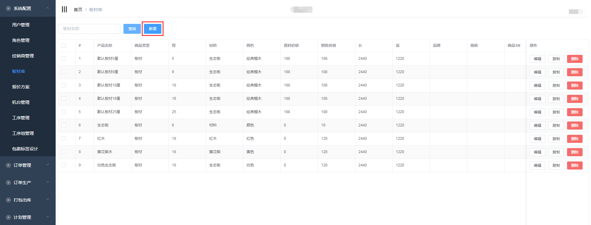 点击系统管理->板材库,进入板材库页面