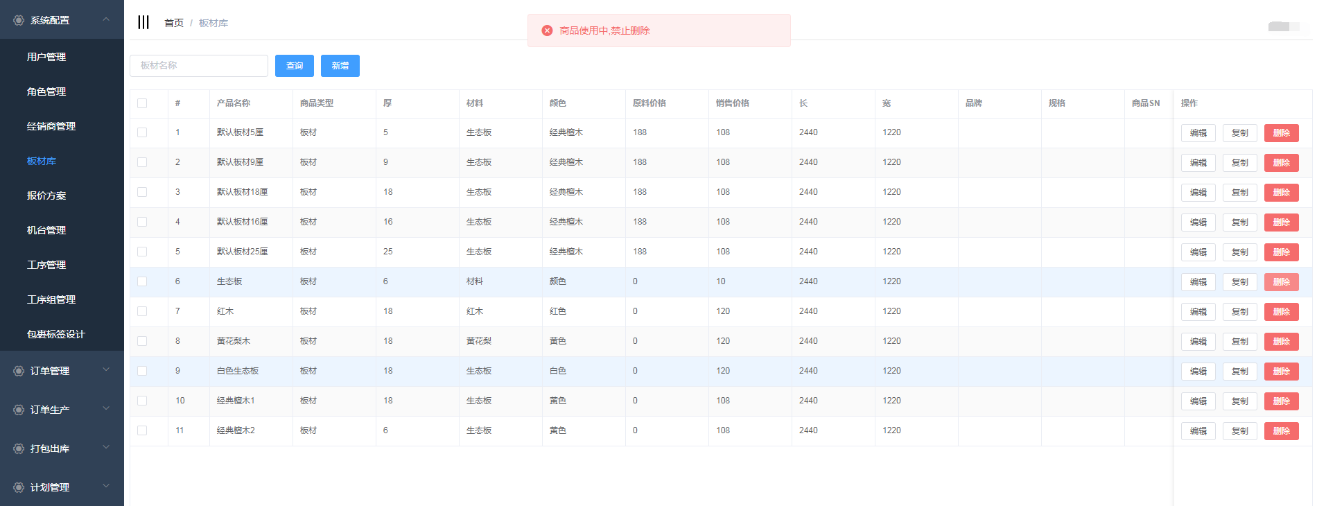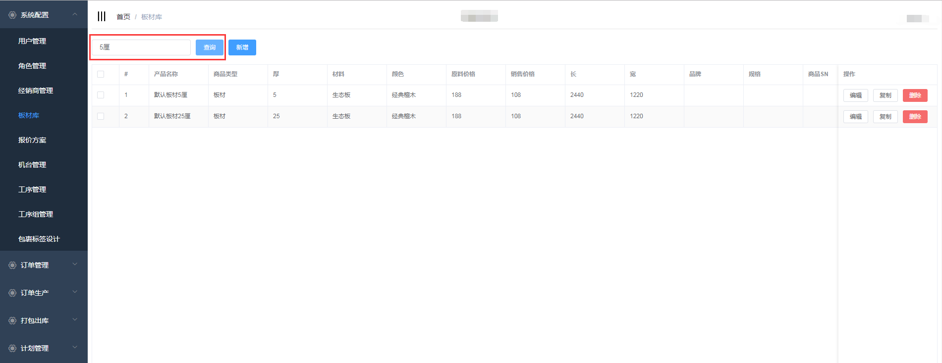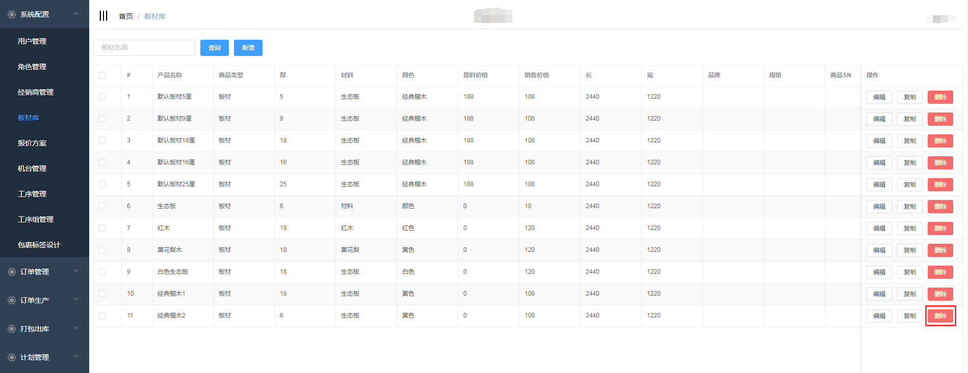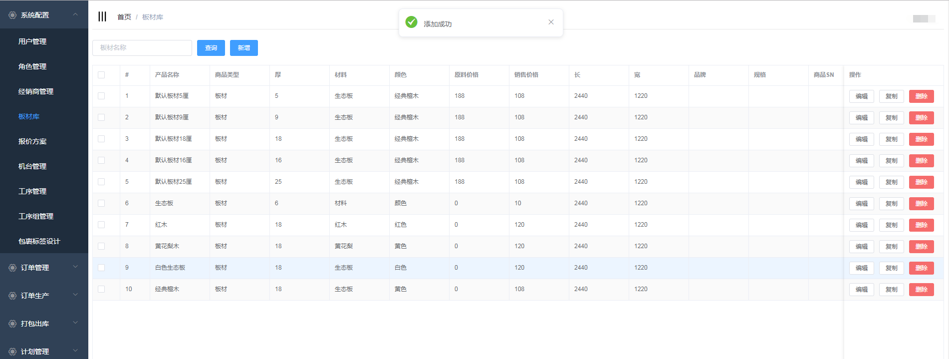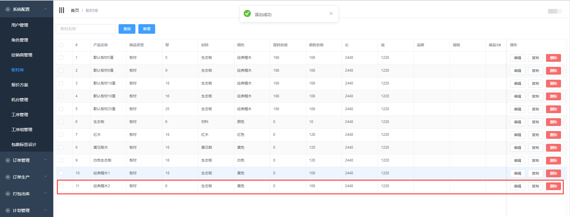点击系统管理->板材库,进入板材库页面