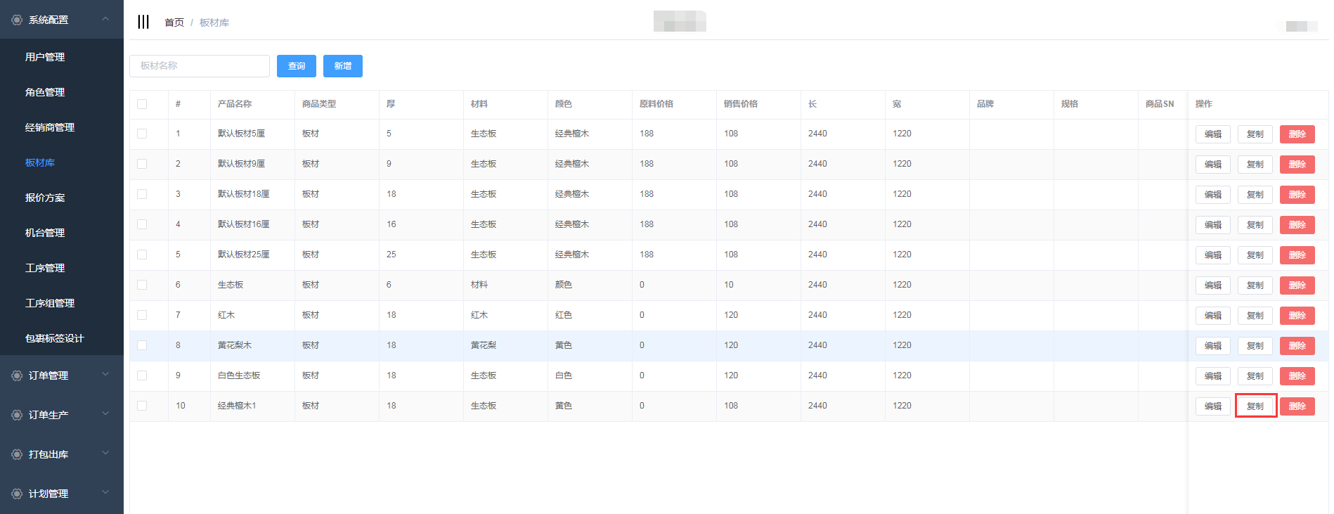 复制功能是为了方便用户新增信息大致相同的板材,通过复制板材,减少了用户填写数据的繁琐