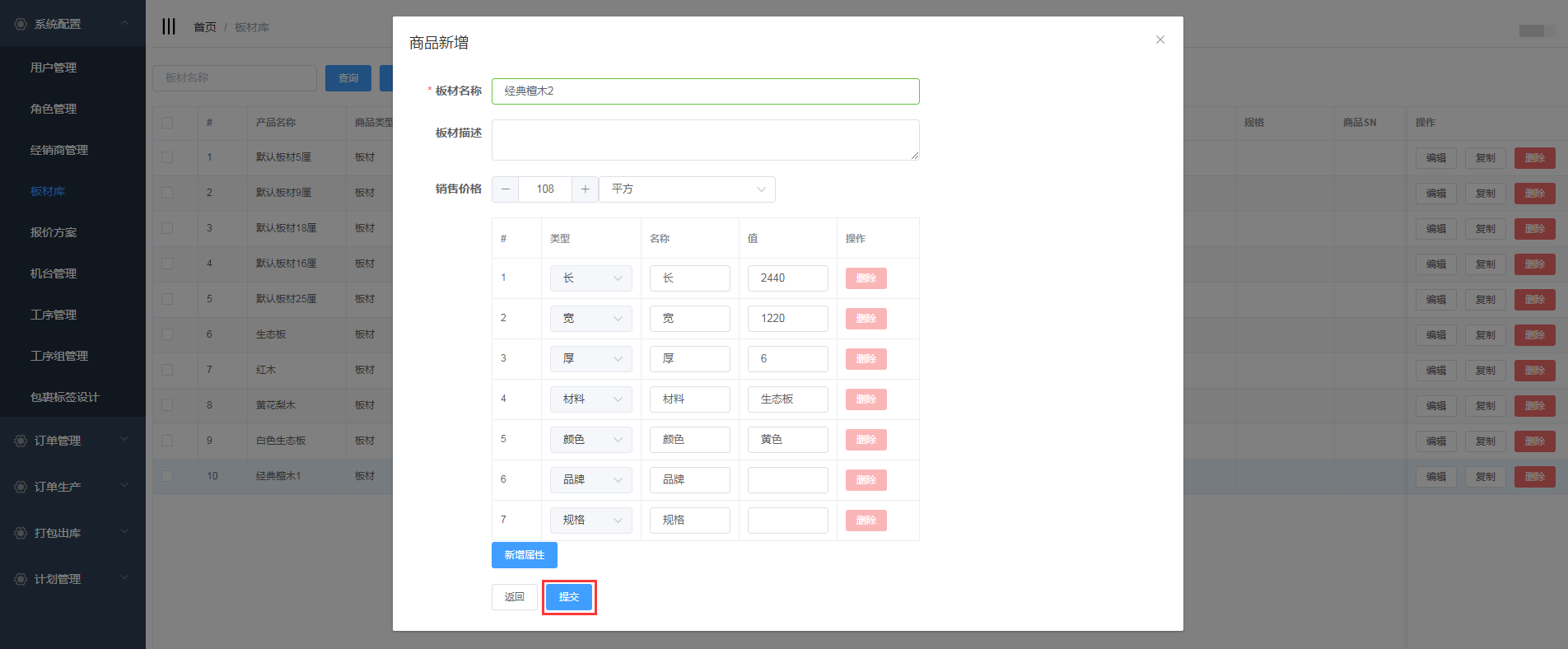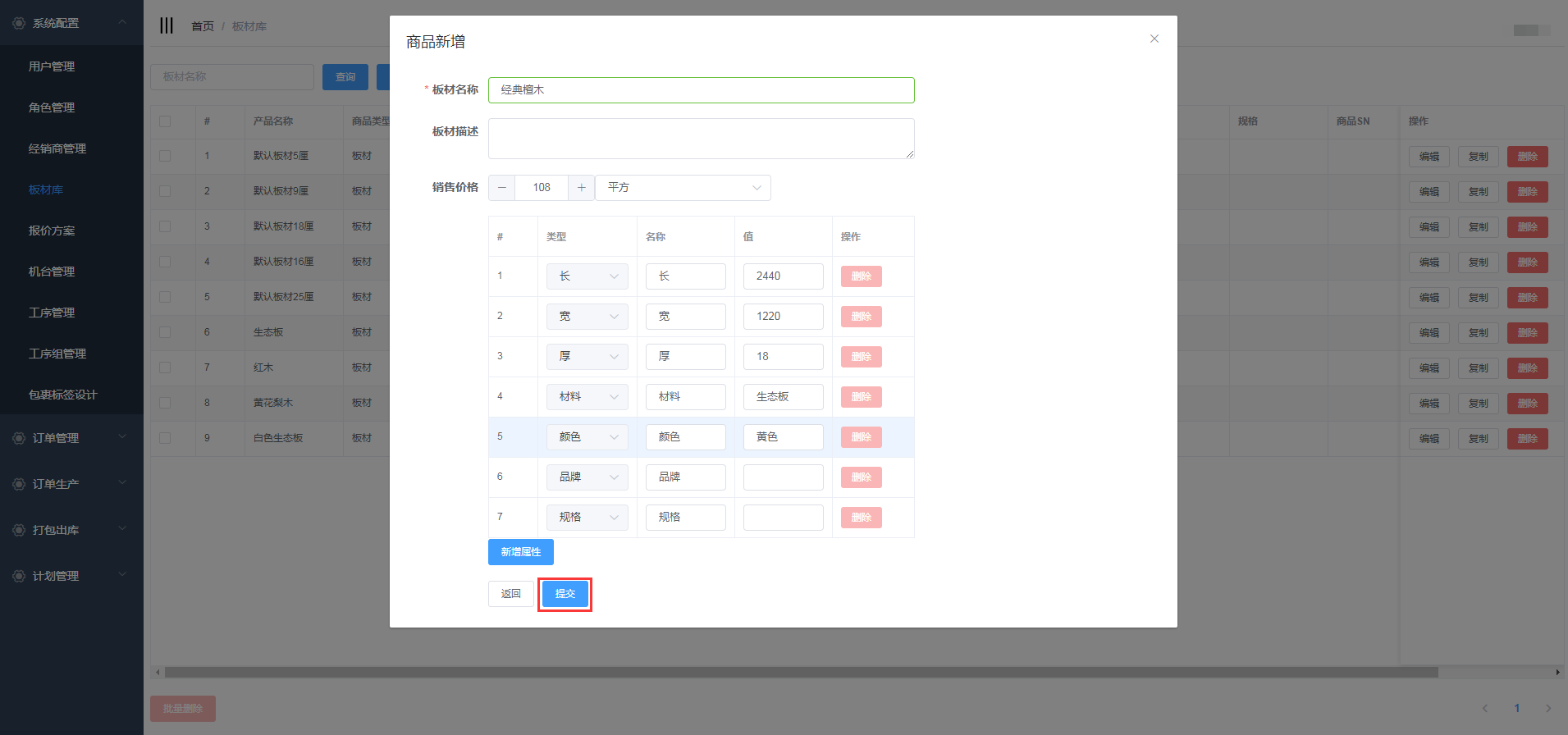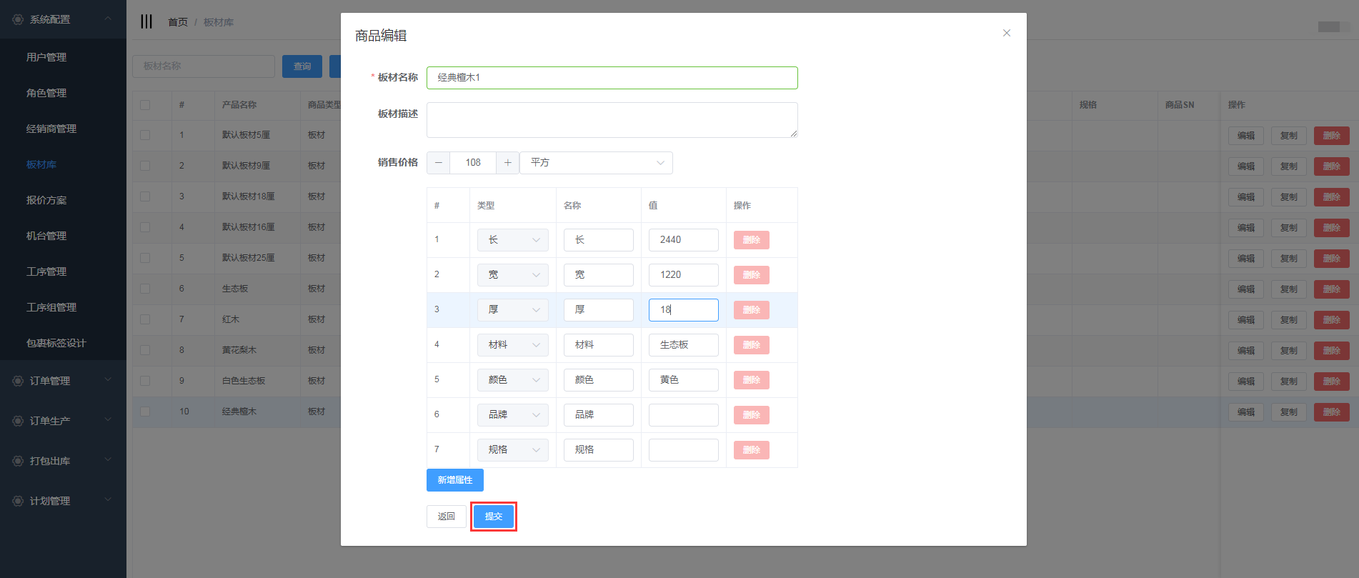 编辑板材名称,商品描述,价格;输入属性值,用户也可对属性进行删除和新增,填写完信息后,点击提交