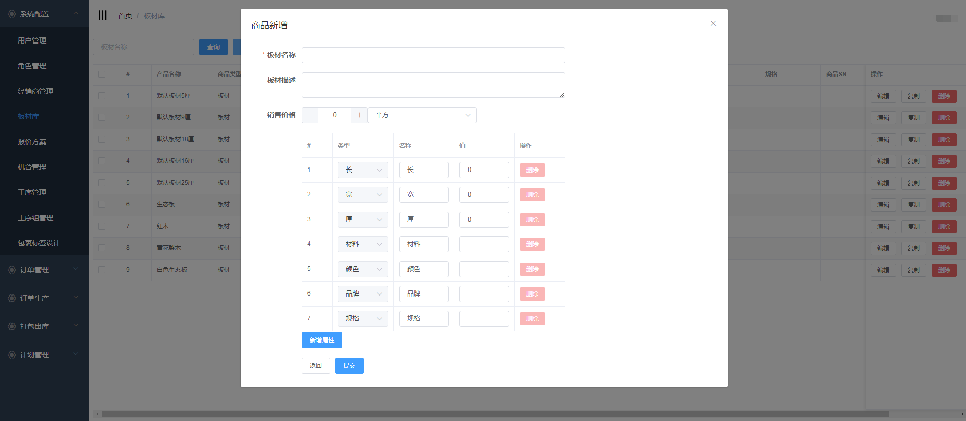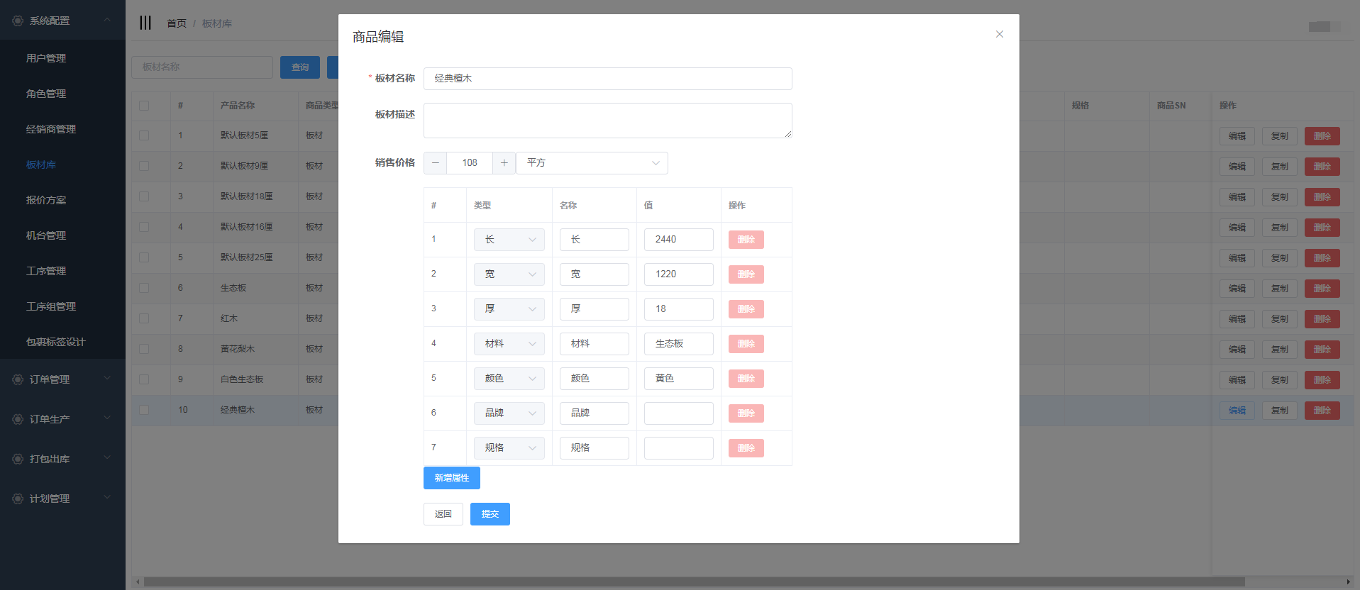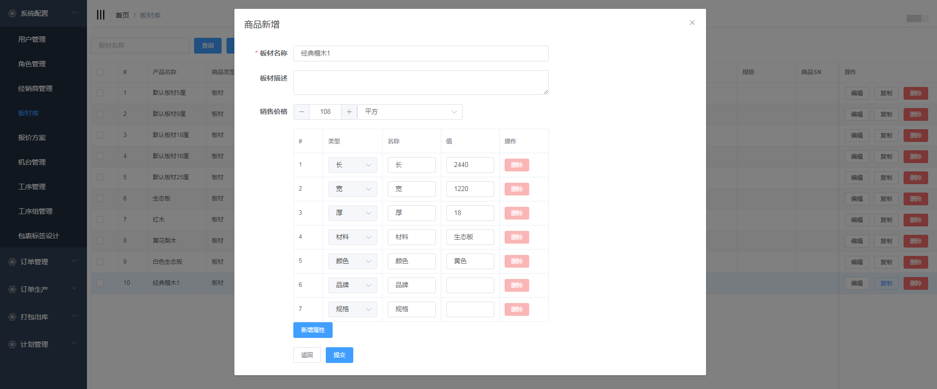 编辑板材名称,商品描述,价格;输入属性值,用户也可对属性进行删除和新增,填写完信息后,点击提交
