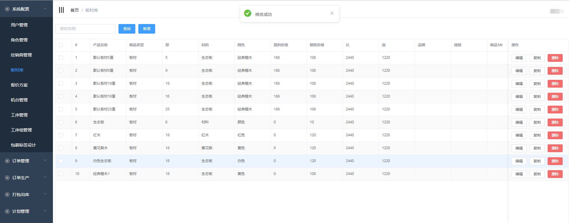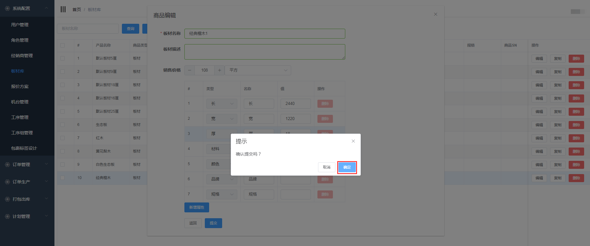 根据用户需求,对板材信息进行修改,点击提交