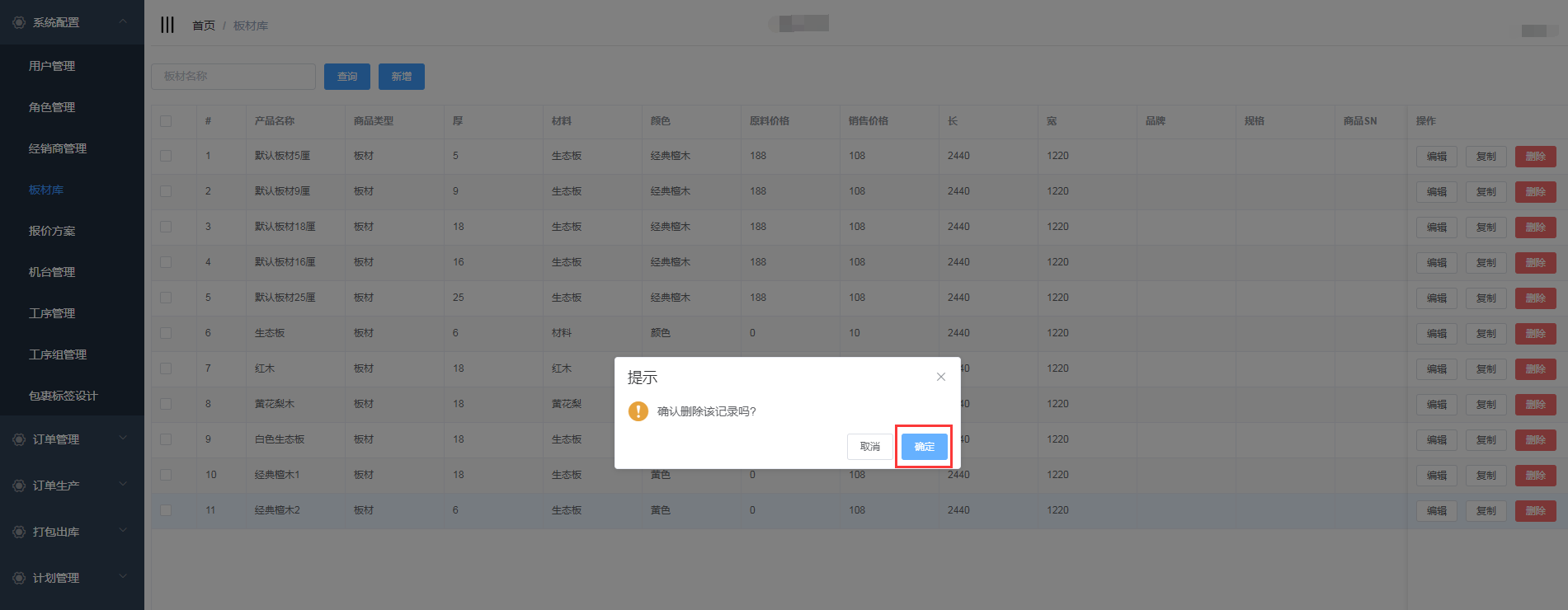 核对是否要删除的板材信息,点击确定按钮