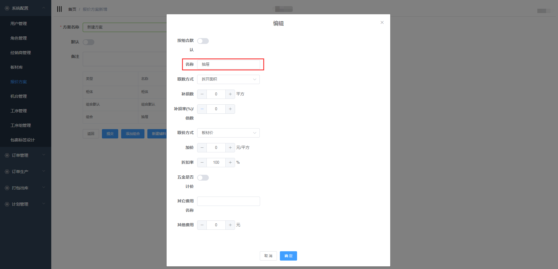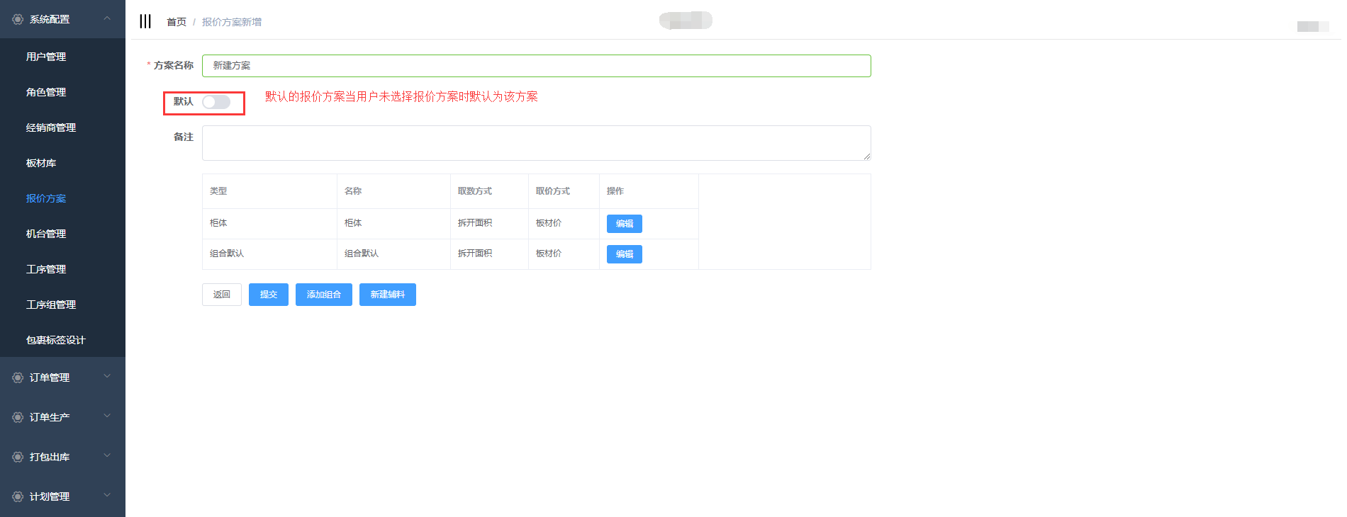 输入方案名称,选择是否为默认方案(在系统中,只能有一个默认的报价方案)