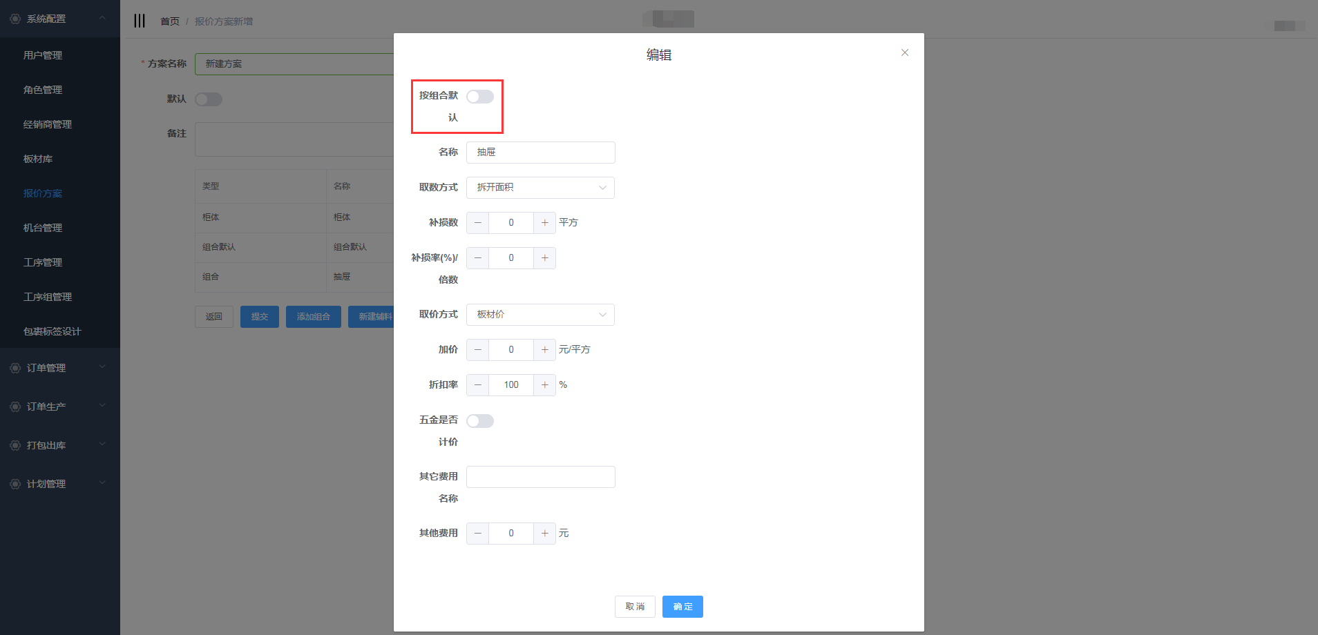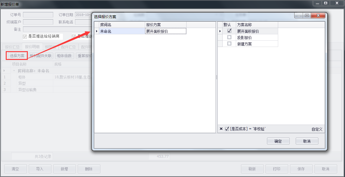 新增成功后,在设计软件拆单报价时按照默认的报价方案进行报价,然而在拆单界面可以进行修改报价方案选择