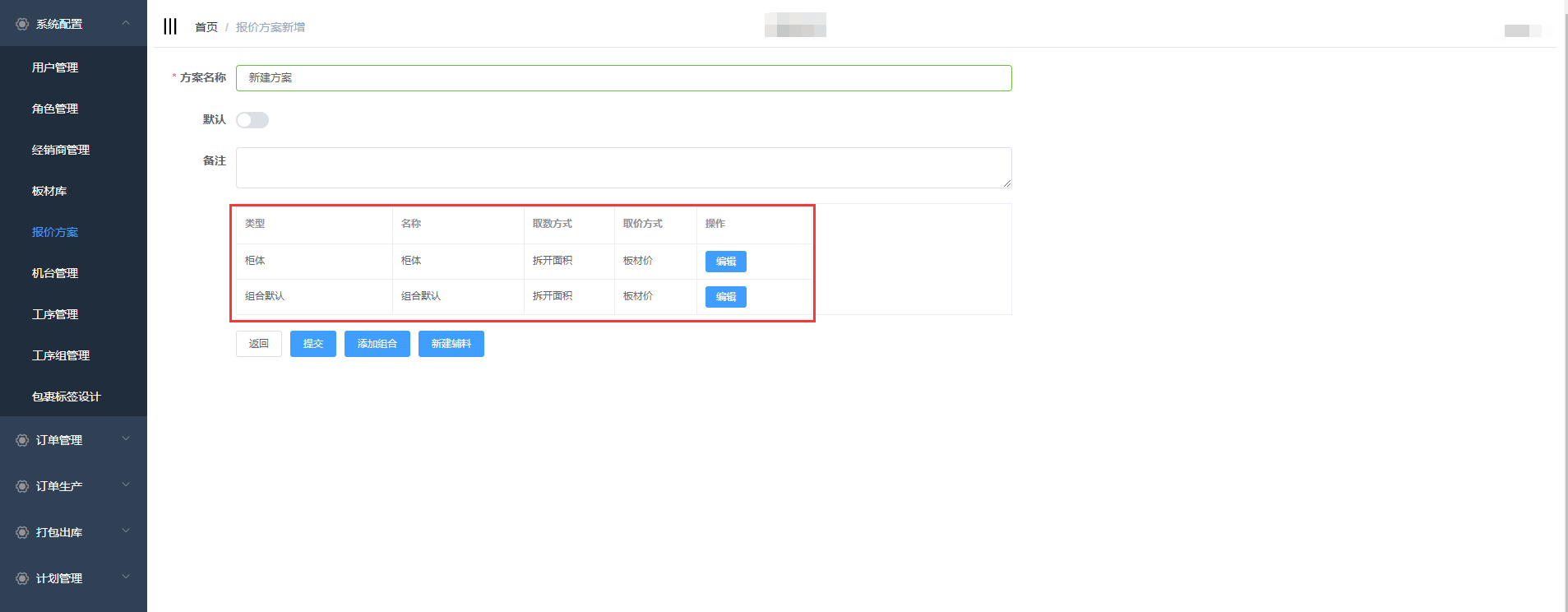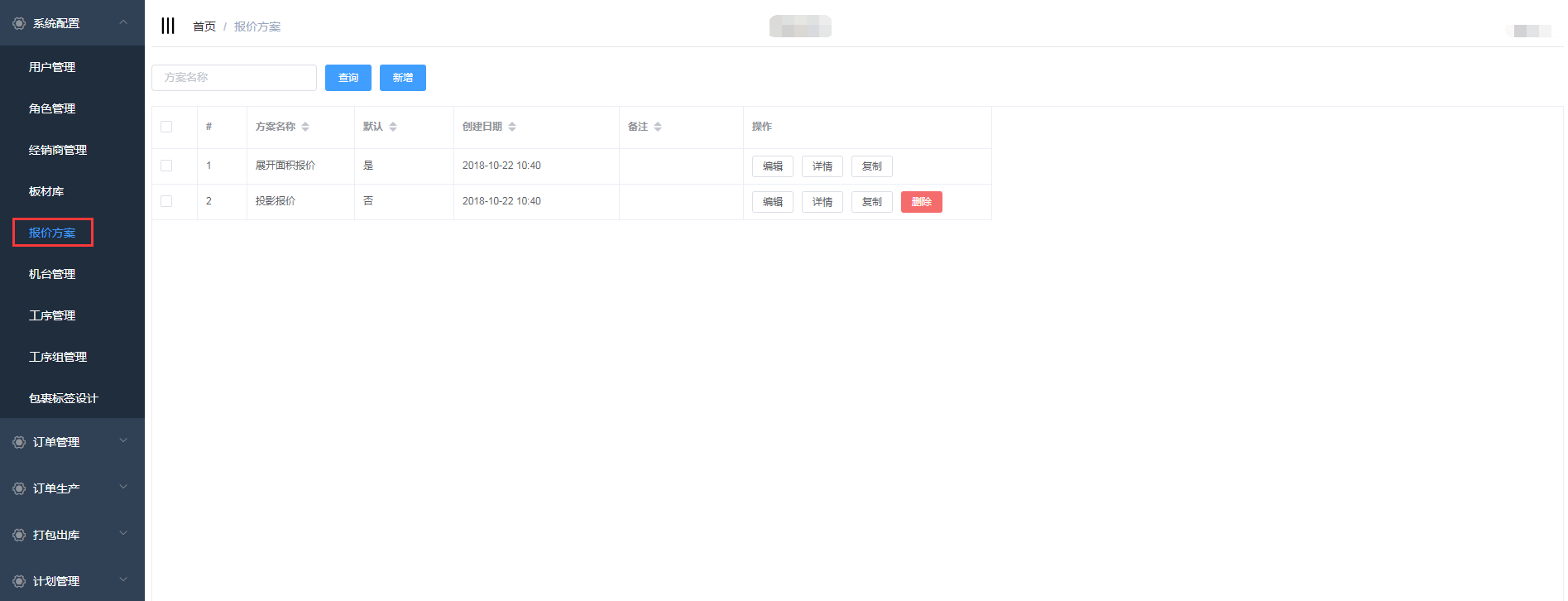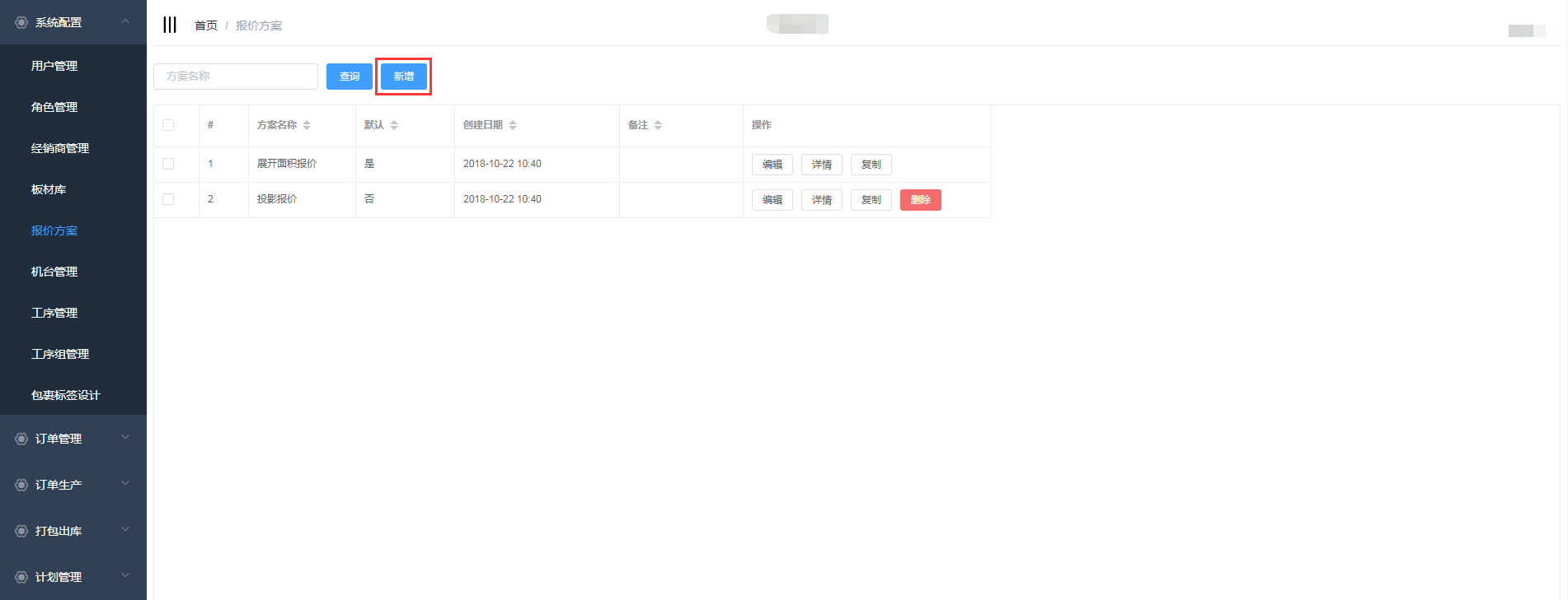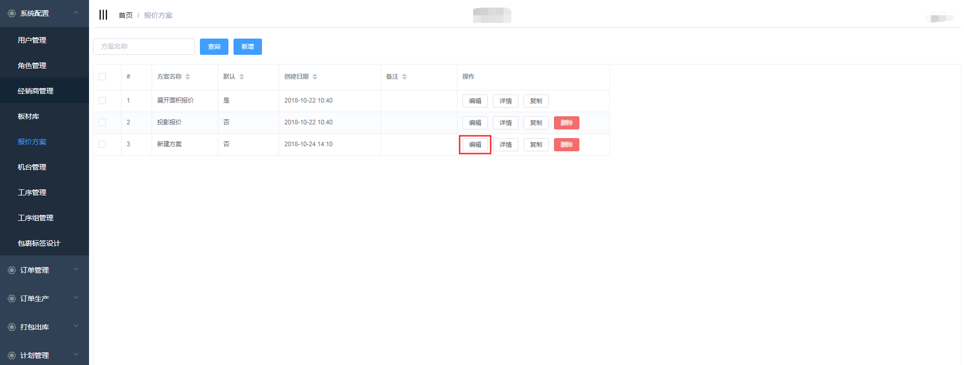 点击系统管理->报价方案,进入报价方案页面 ,系统会给一些默认的报价方案,当然,用户也可自行新增和编辑报价方案
