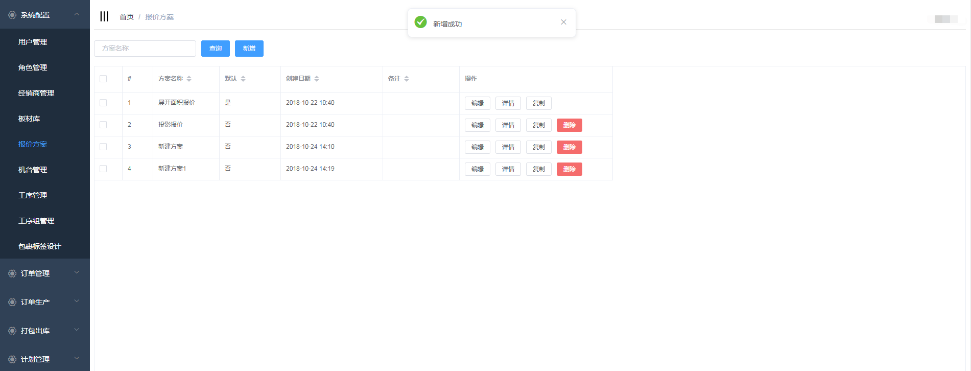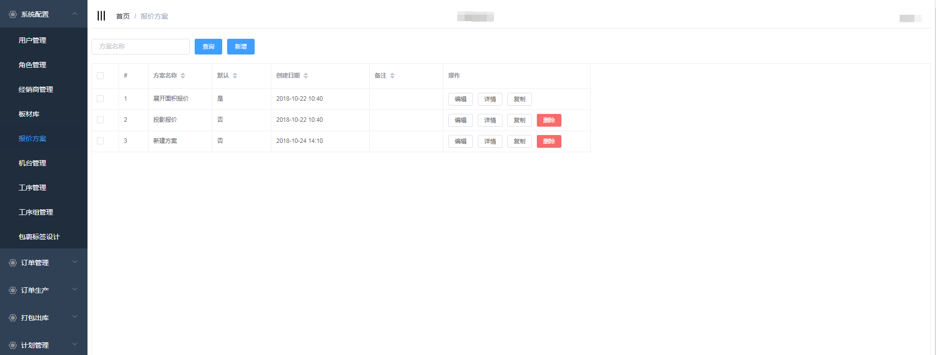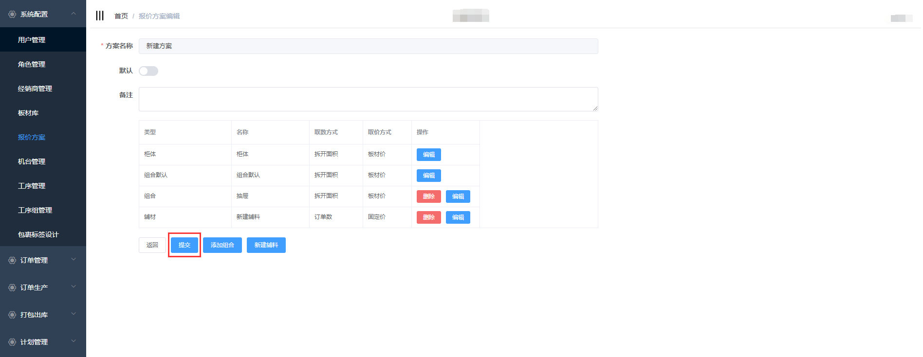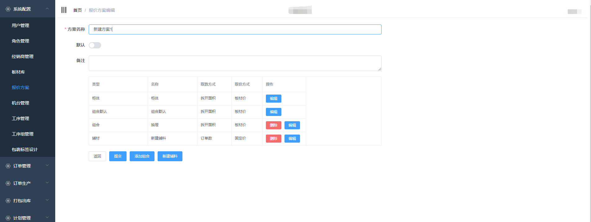 点击系统管理->报价方案,进入报价方案页面 ,系统会给一些默认的报价方案,当然,用户也可自行新增和编辑报价方案