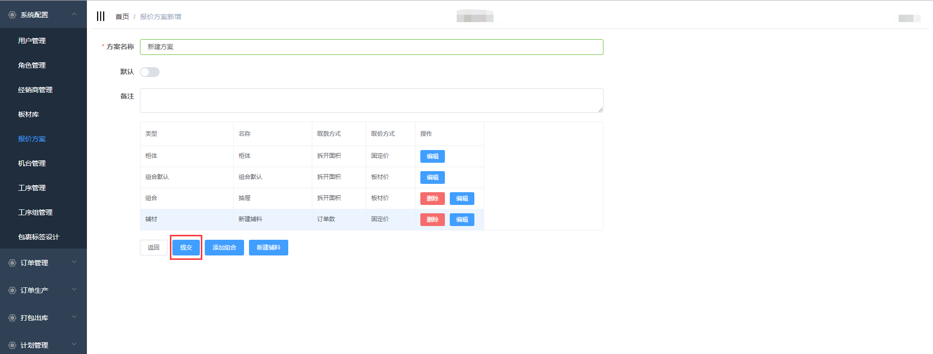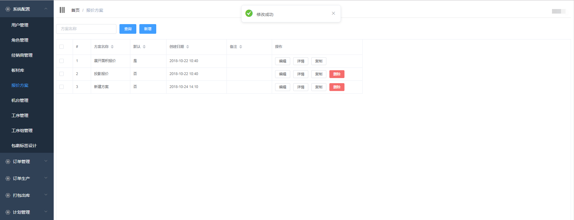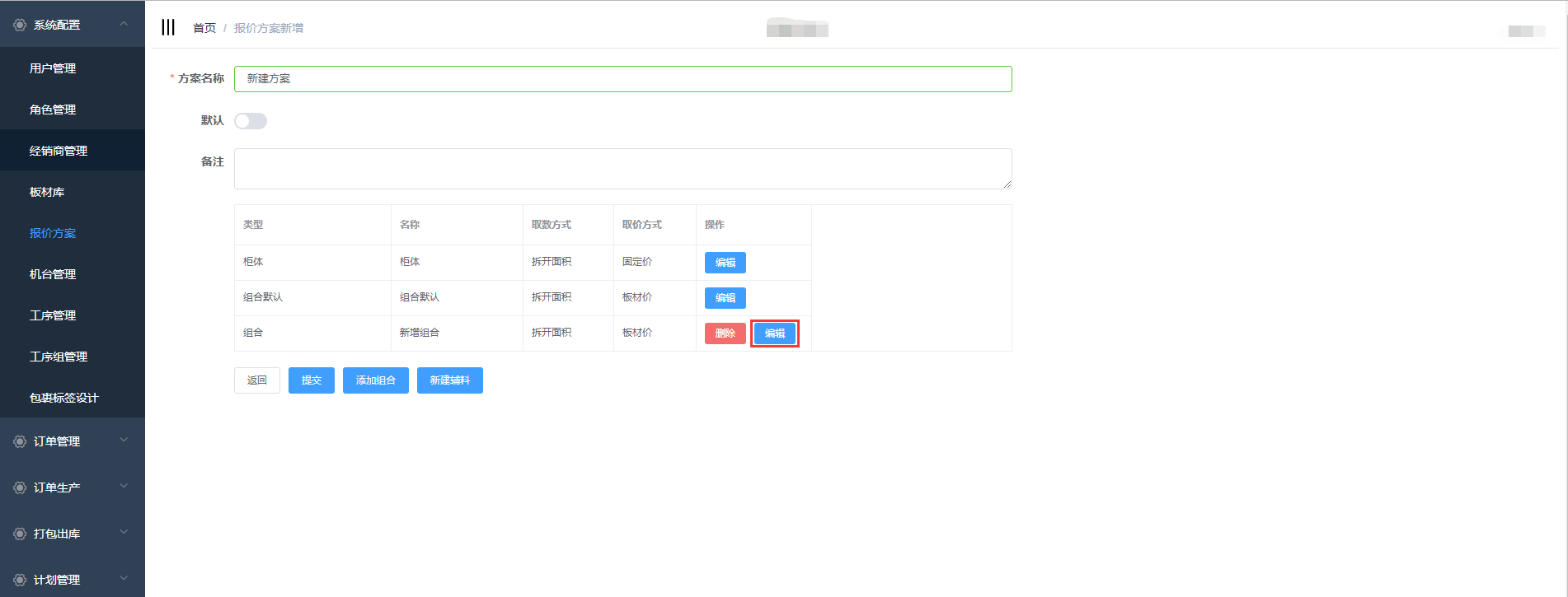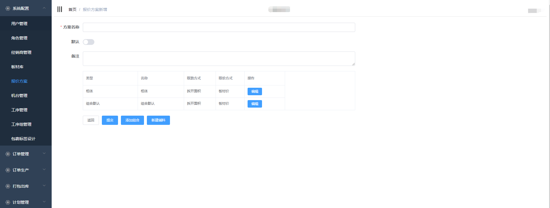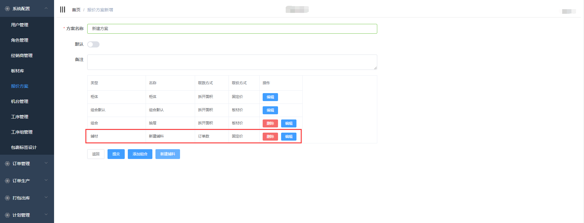 点击系统管理->报价方案,进入报价方案页面 ,系统会给一些默认的报价方案,当然,用户也可自行新增和编辑报价方案