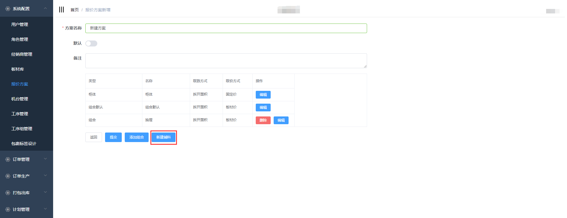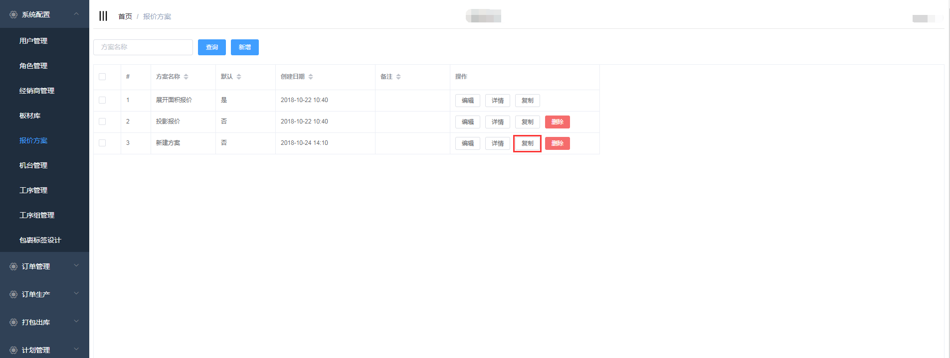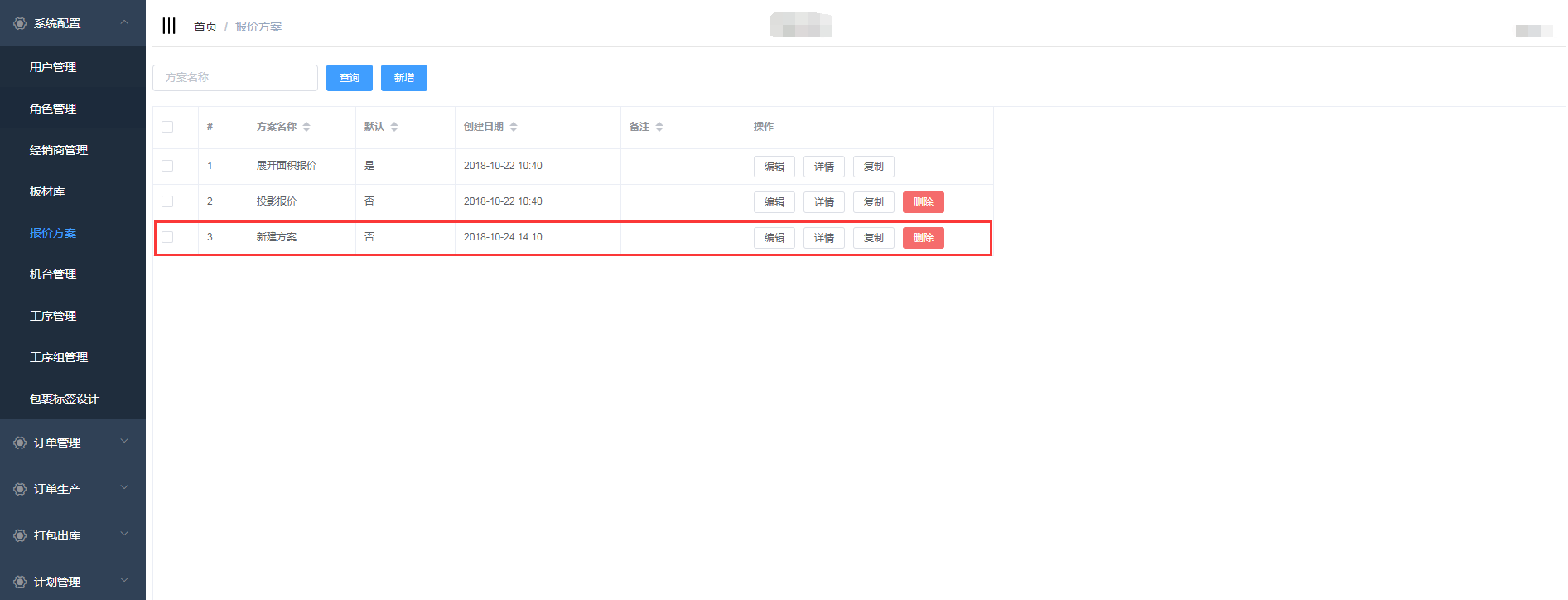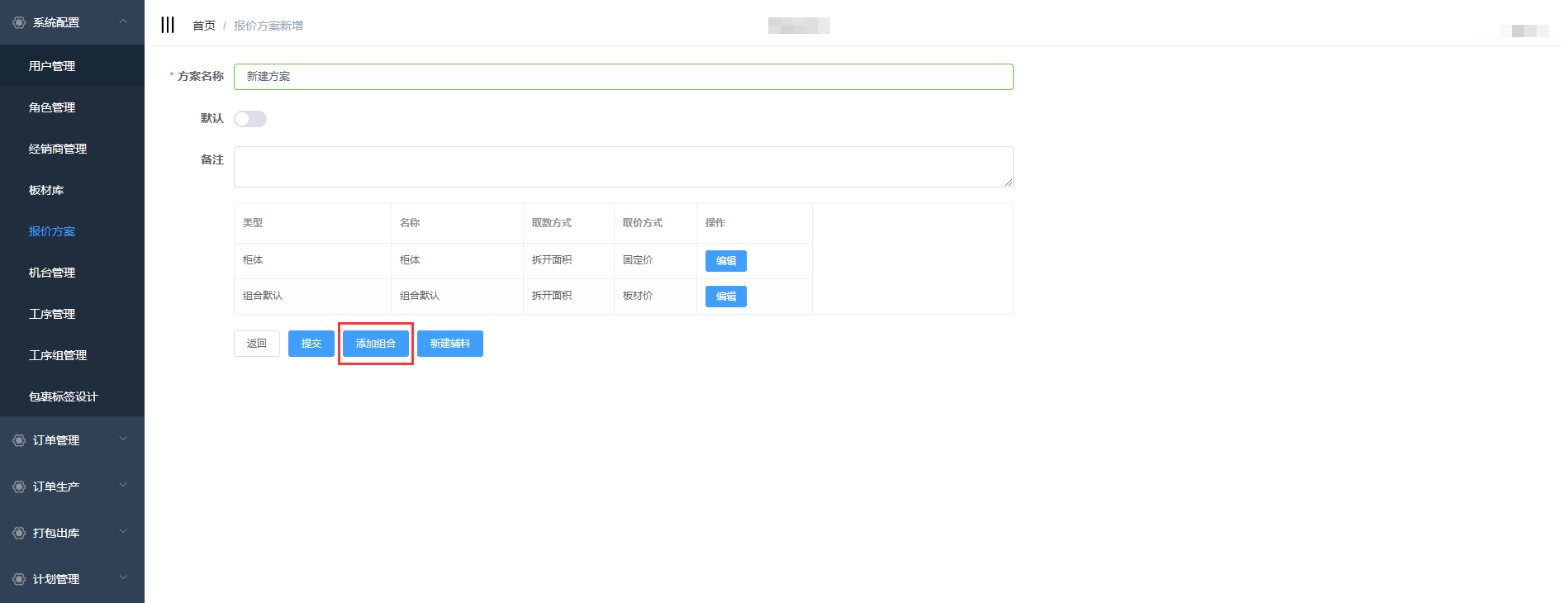 点击系统管理->报价方案,进入报价方案页面 ,系统会给一些默认的报价方案,当然,用户也可自行新增和编辑报价方案