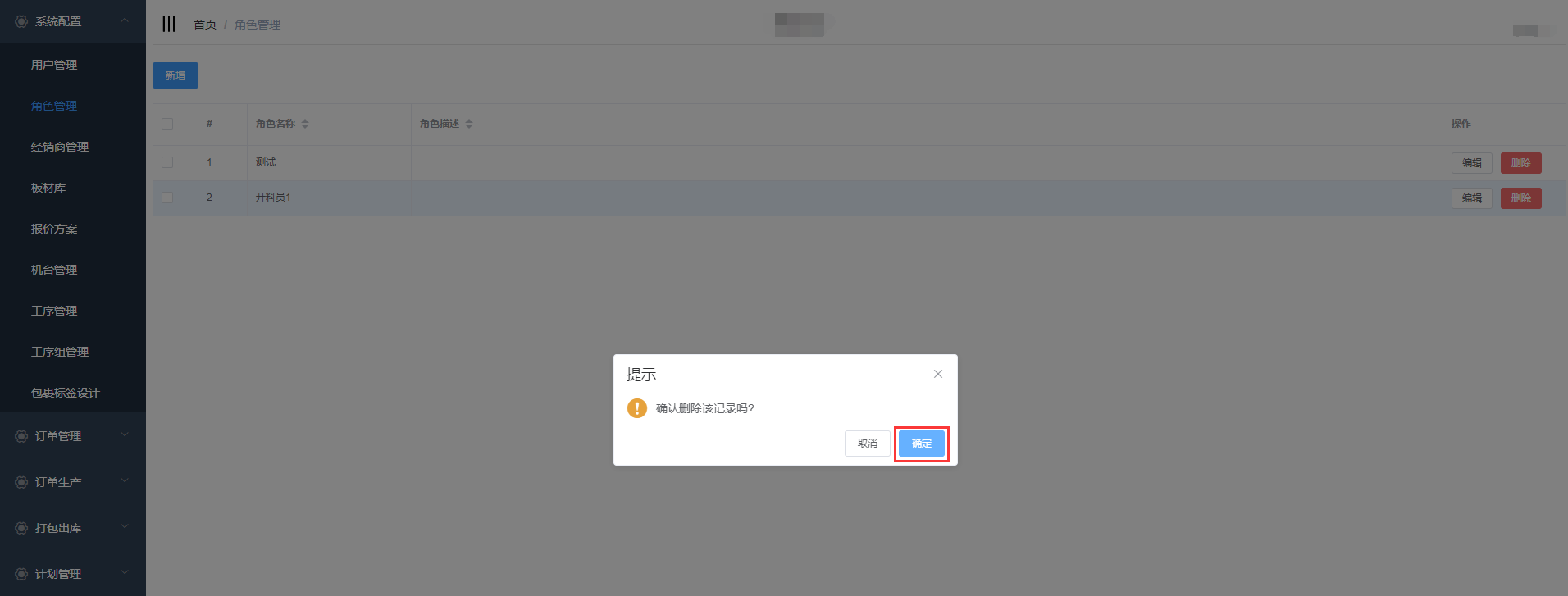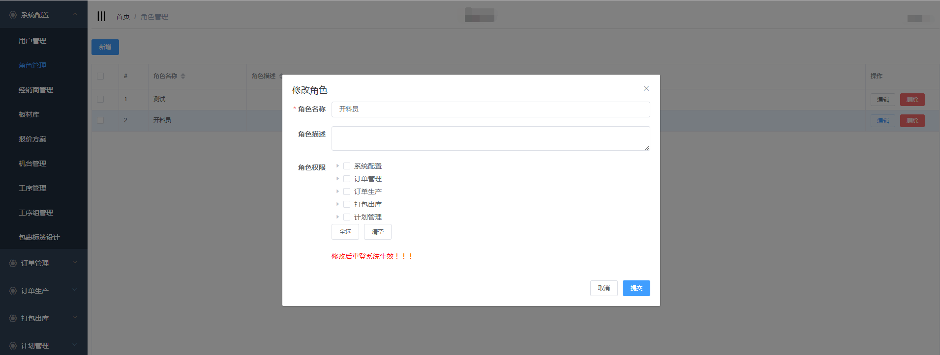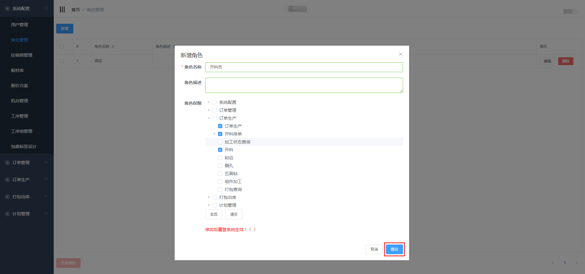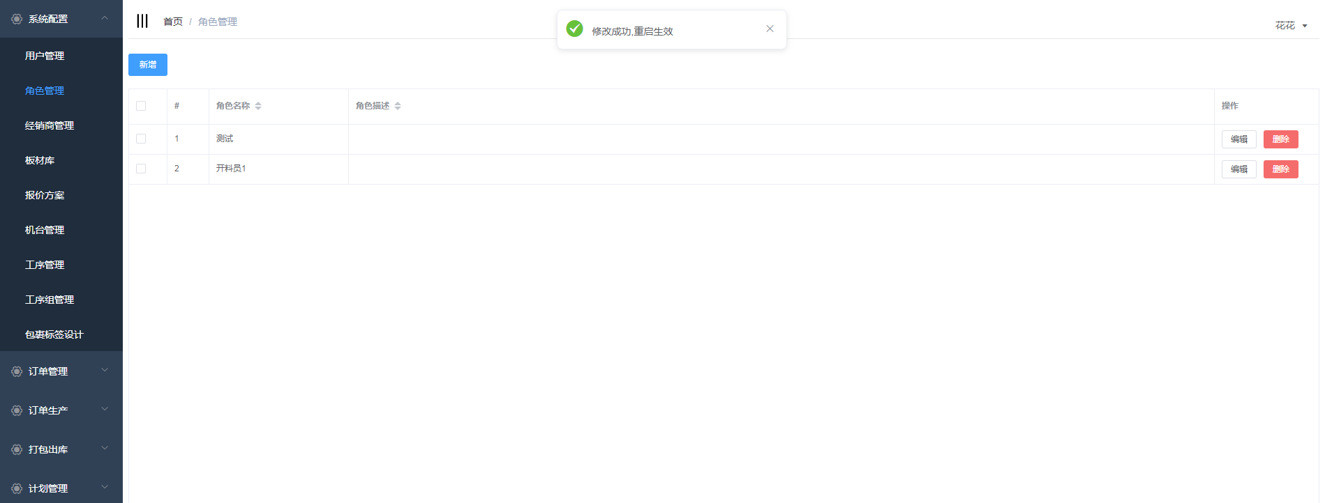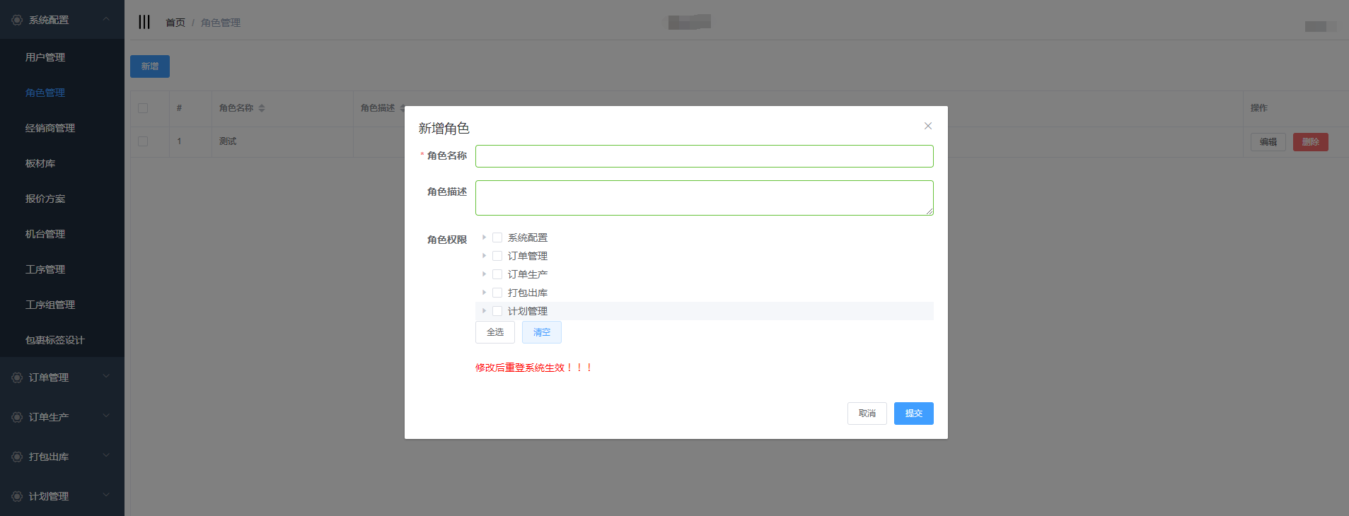新增成功(注意:新增和修改角色权限后,需要重新登录系统才生效)