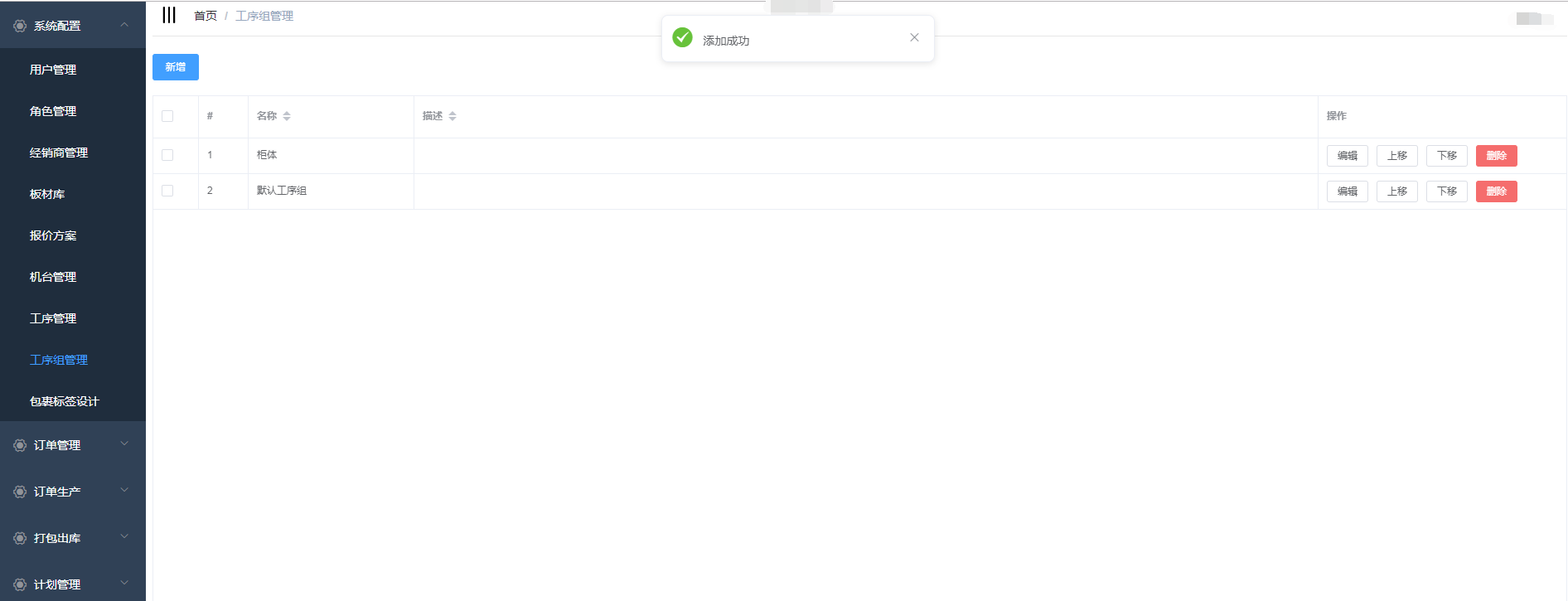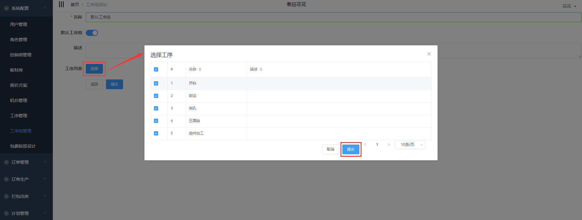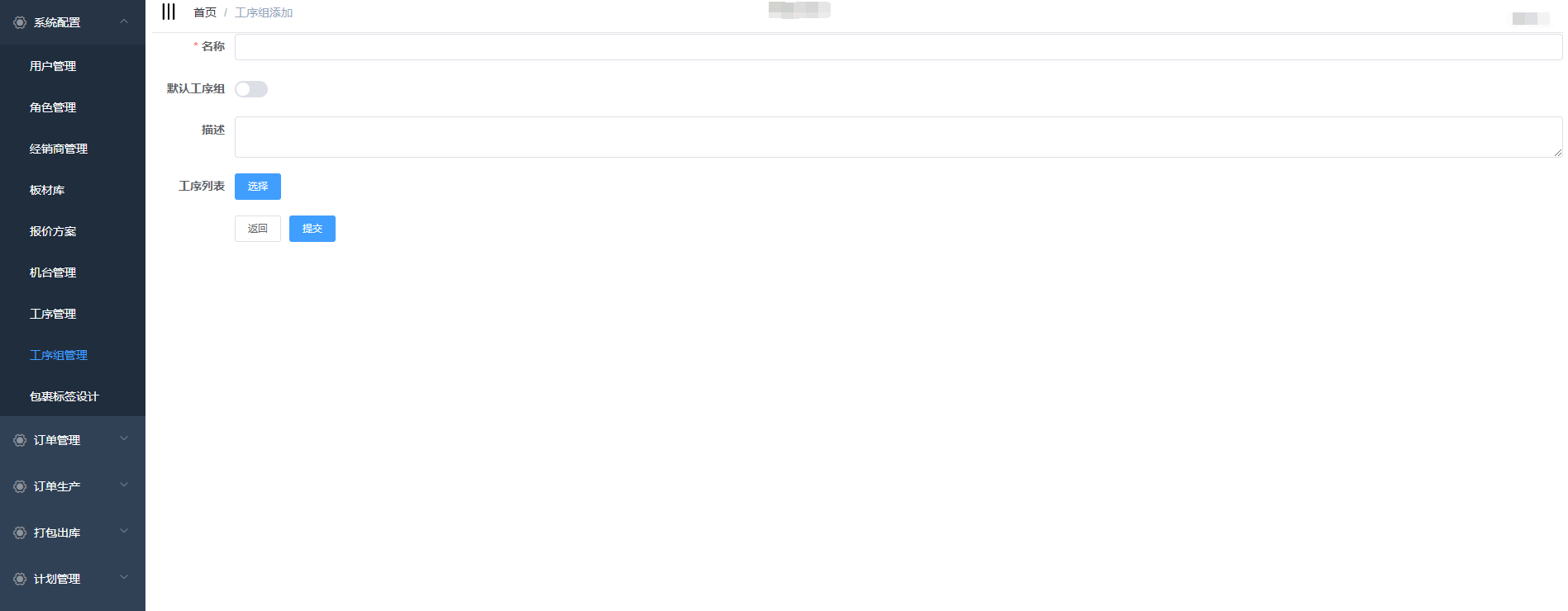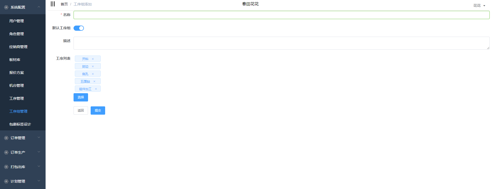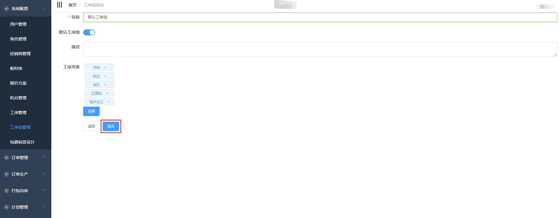 输入工序名称、描述,选择是否为默认工序组,点击提交