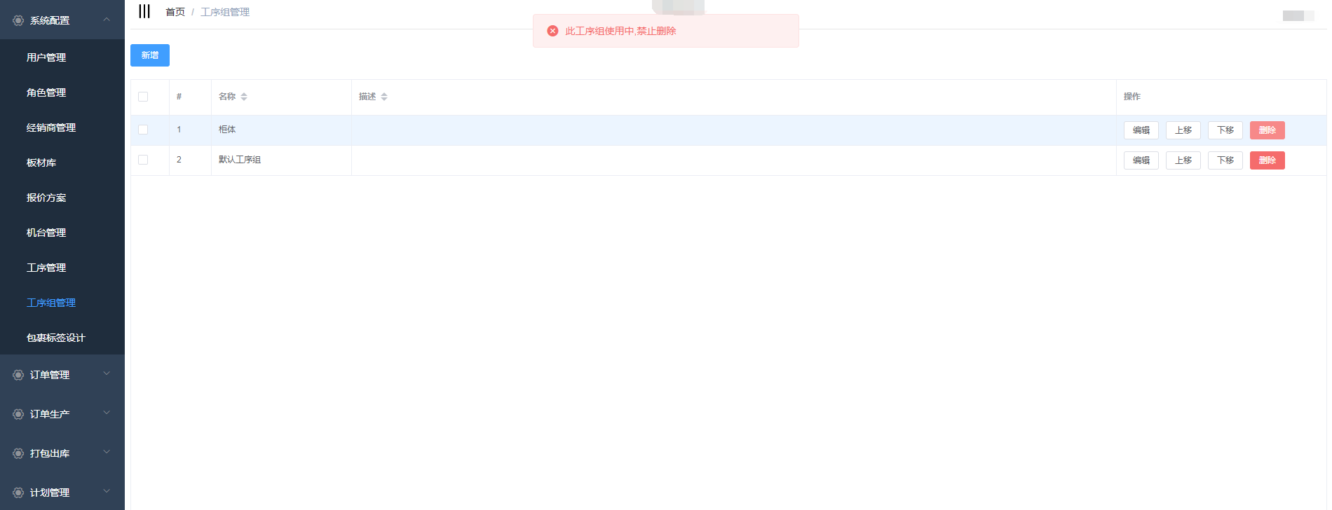 对于正在使用中的工序组是不允许删除的