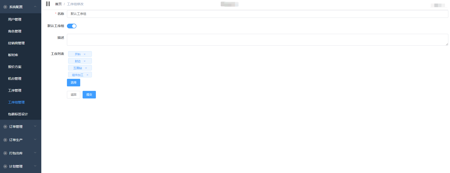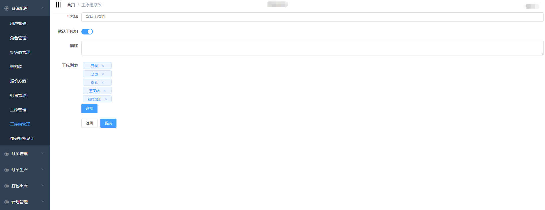 根据需求进行修改,点击提交(修改工序组不会影响正在使用中的订单)