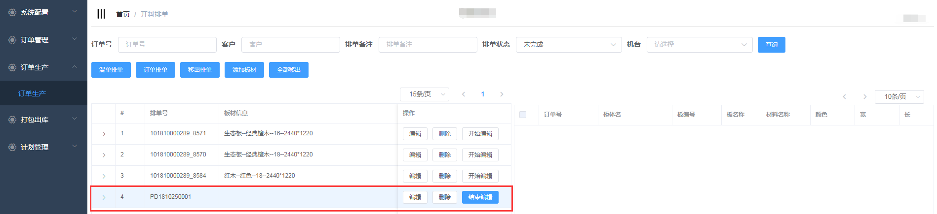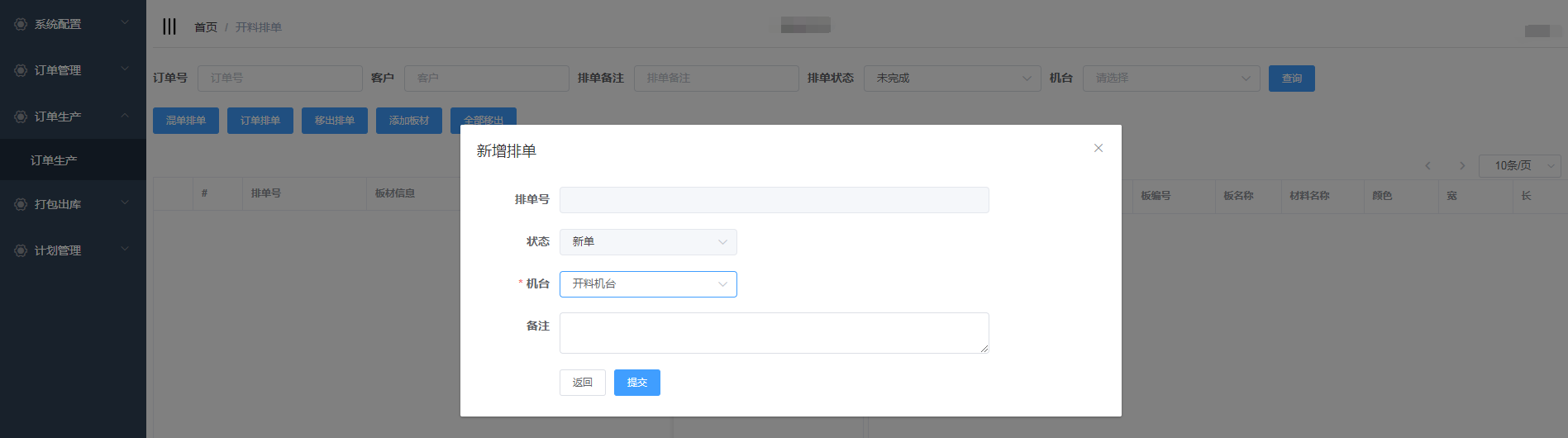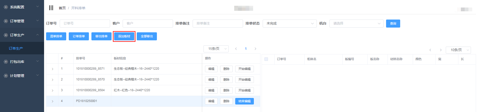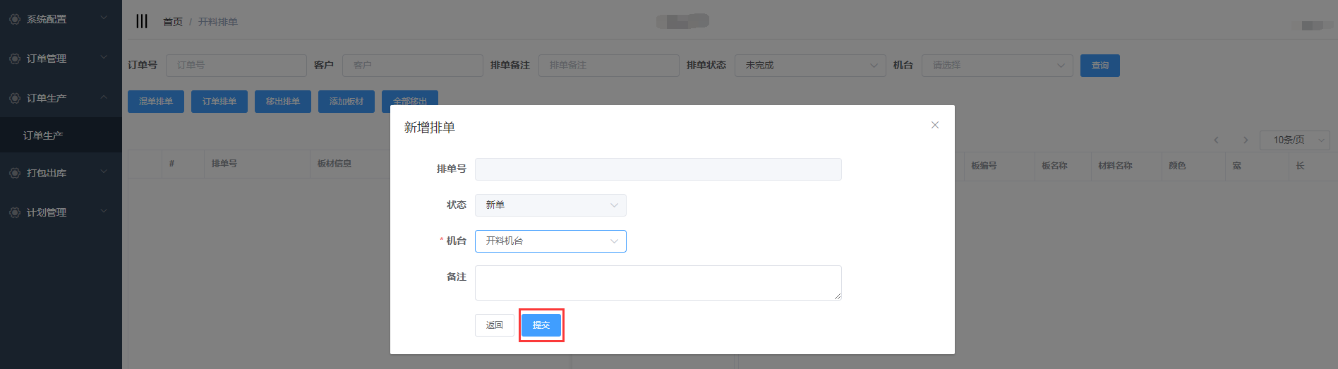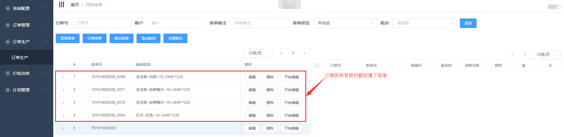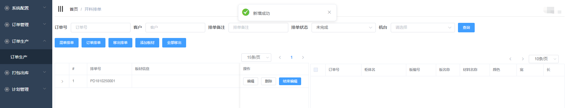 排单新增成功,会自动生成排单号,并且在开料排单界面显示(新增的混单排单需要手动添加板材)