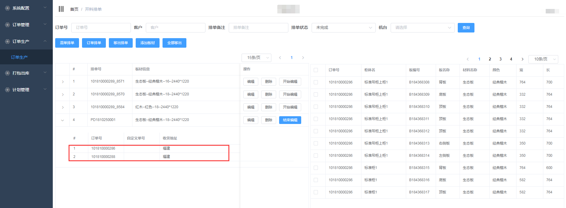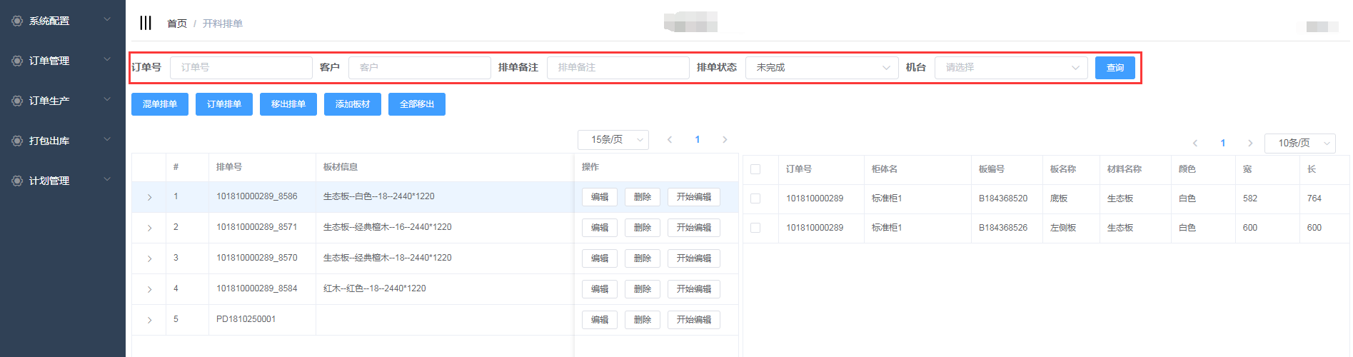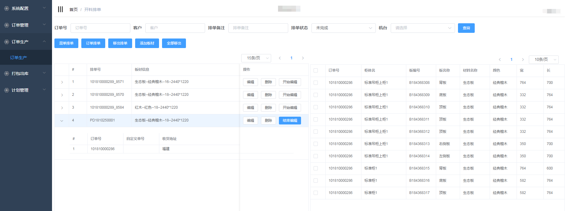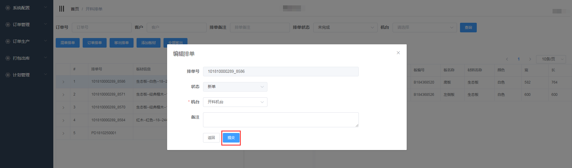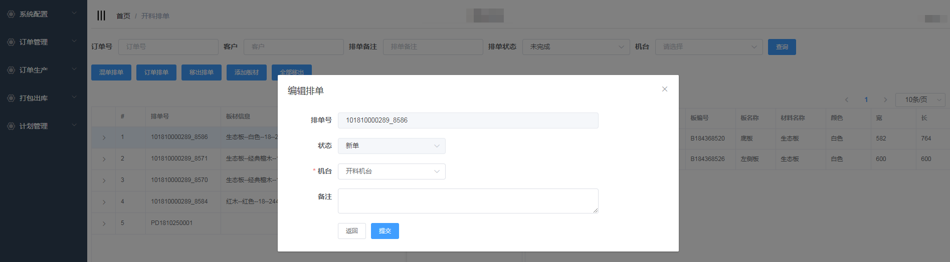 排单新增成功,会自动生成排单号,并且在开料排单界面显示(新增的混单排单需要手动添加板材)