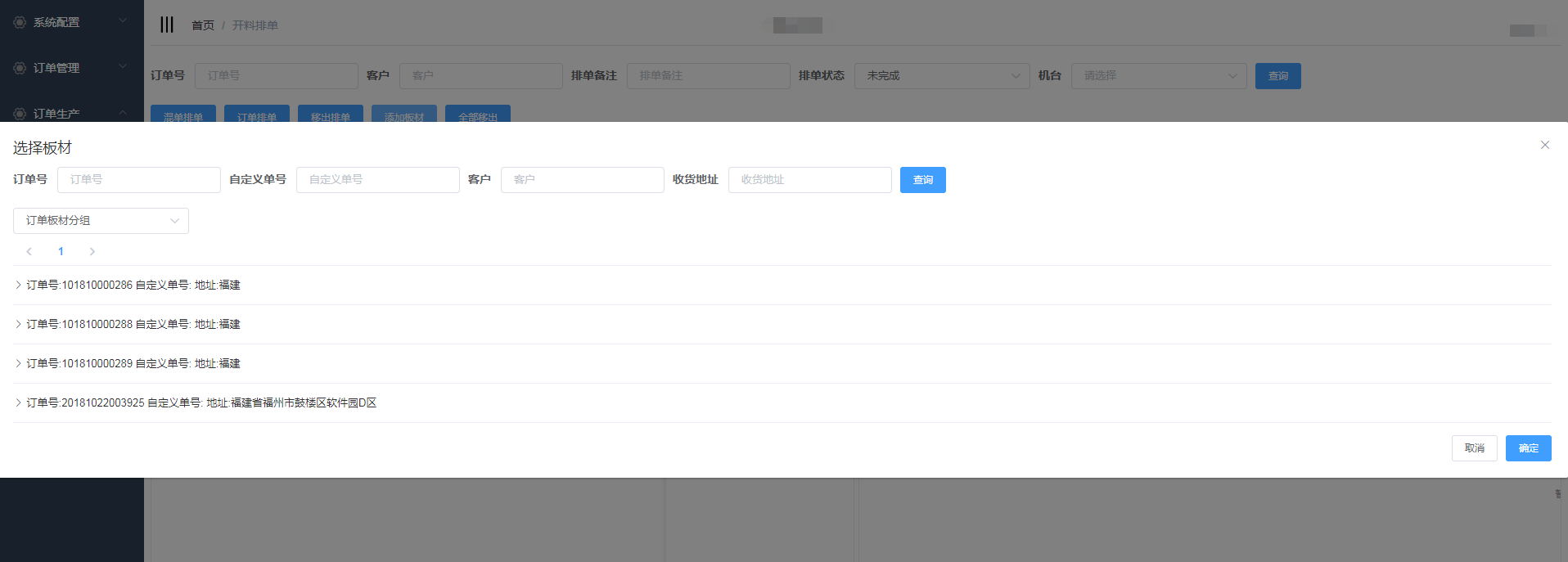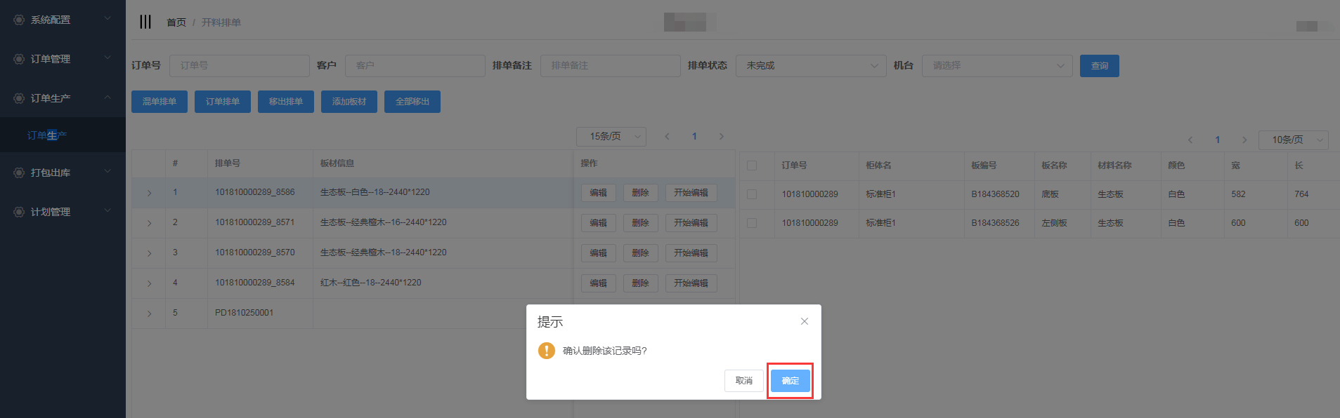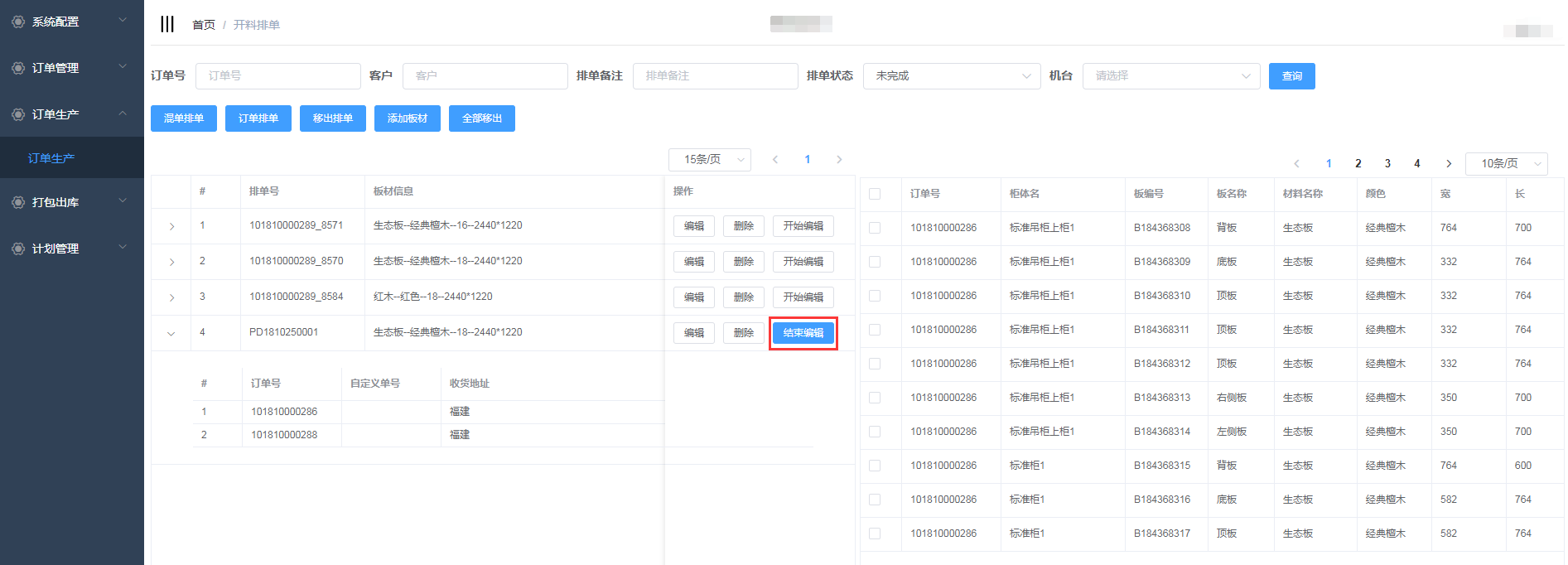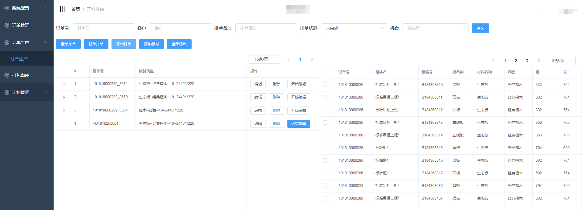 排单新增成功,会自动生成排单号,并且在开料排单界面显示(新增的混单排单需要手动添加板材)