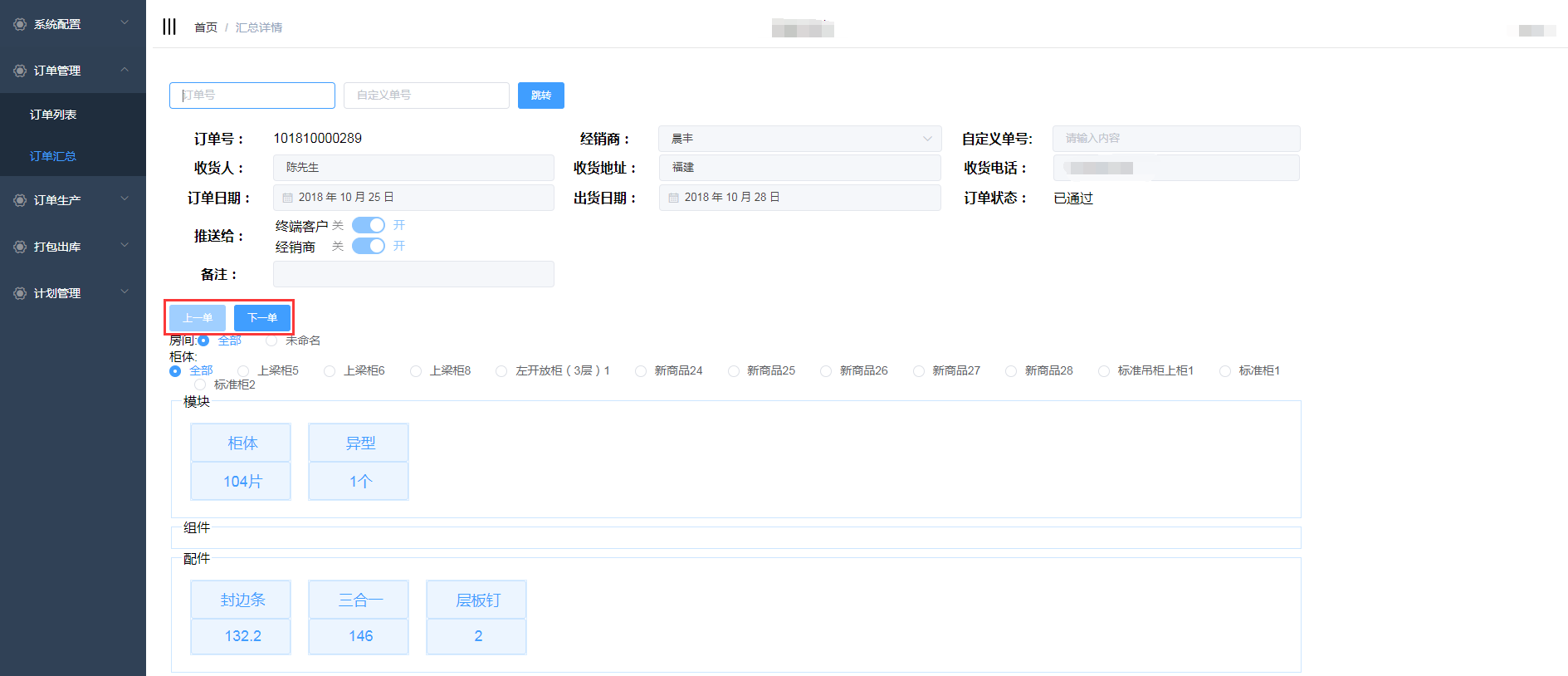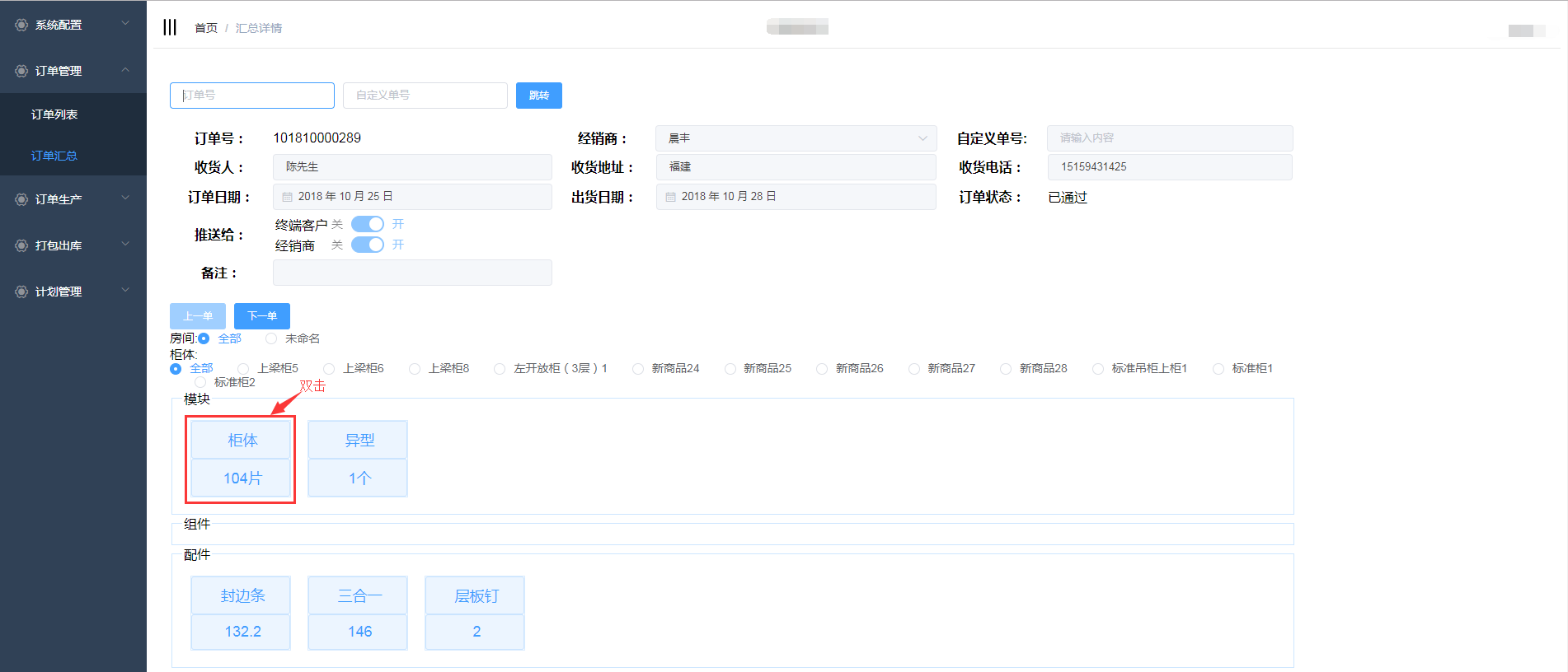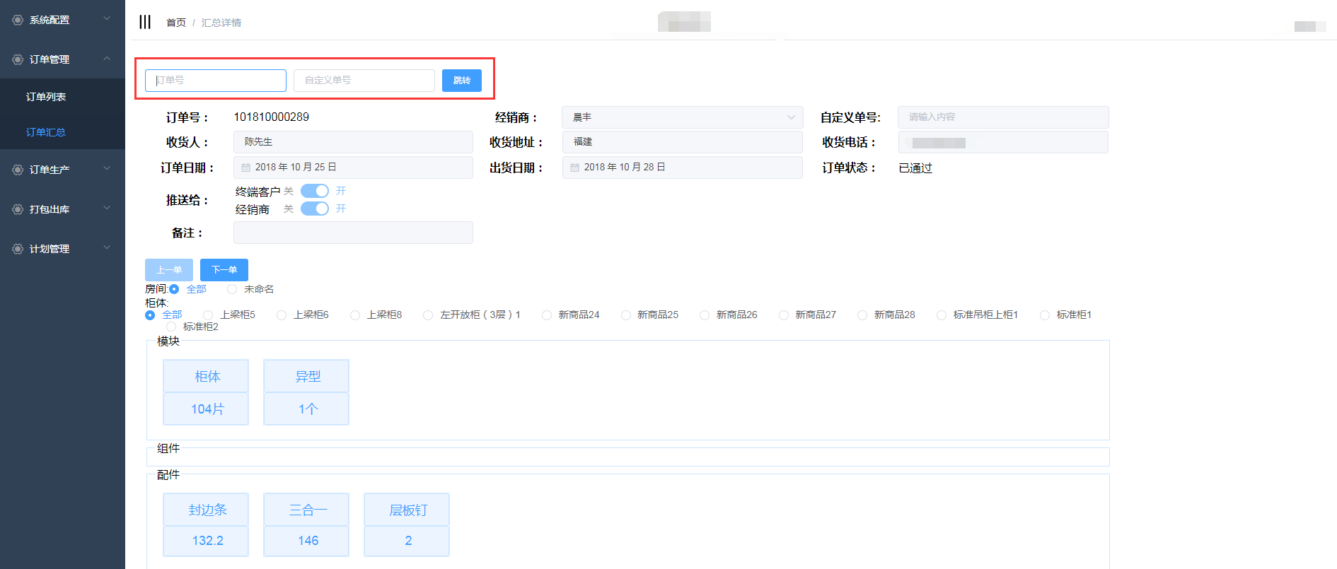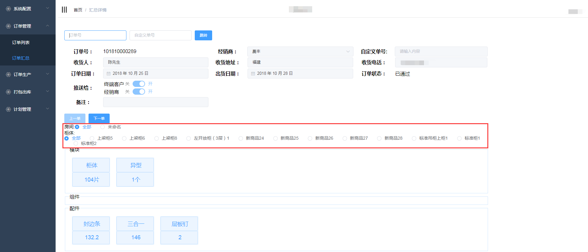 2.3、用户可以根据房间名和柜体名进行查询模块,组件,配件数据
