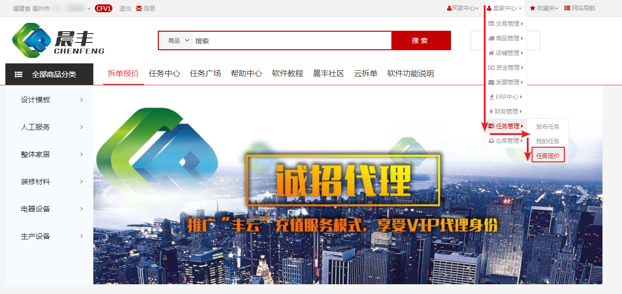设计师登录晨丰爱家网,选择卖家中心——任务管理——任务定价;