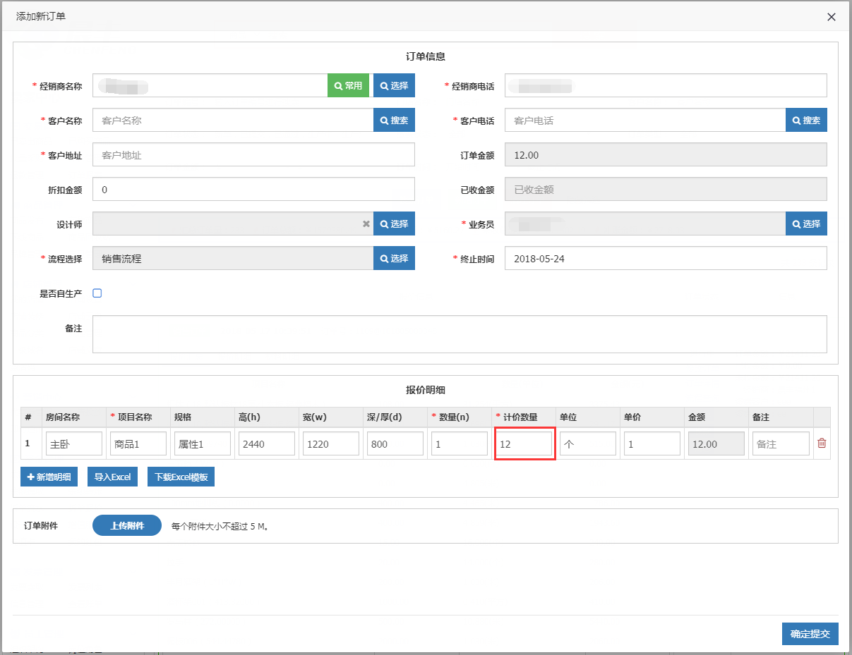 新增订单成功;新增的商品属性会显示在订单的报价明细中;