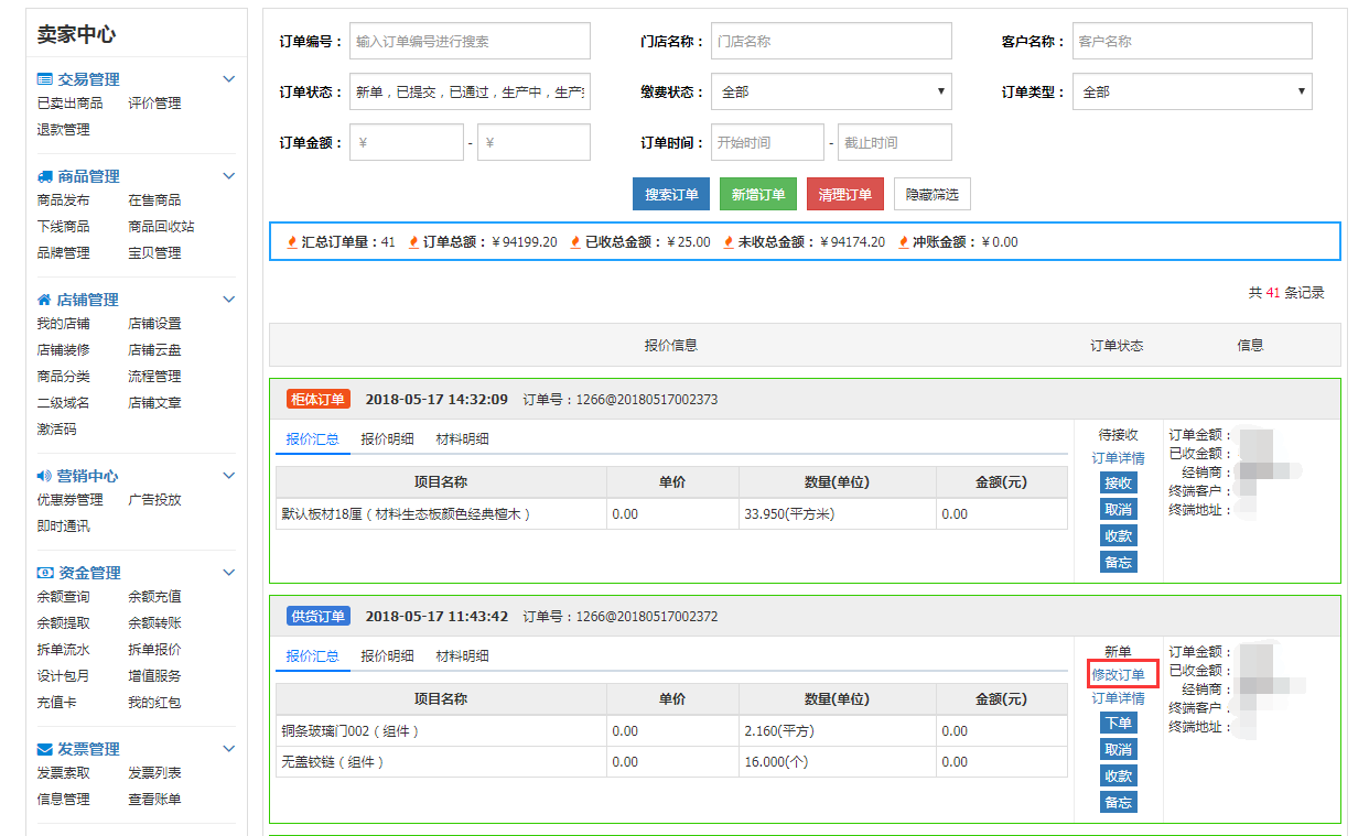 如果工厂选择接收该子单,则要先进行板材对应和计算报价,这样才能够显示该笔订单加工需要多少费用;