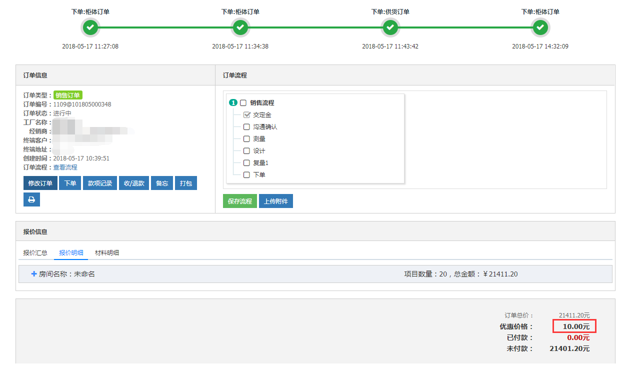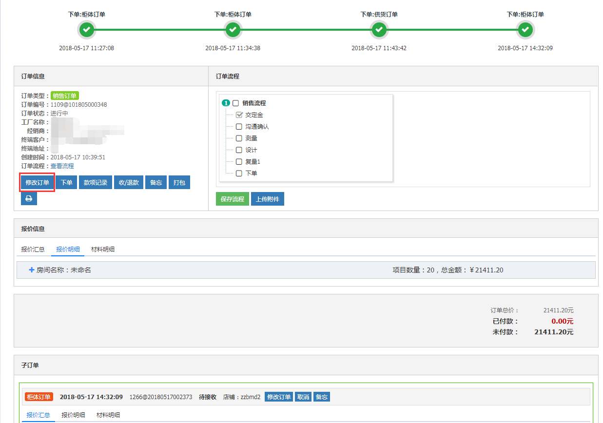 订单详情页包含订单信息、订单流程、报价信息,如果有子订单则也会显示子订单信息