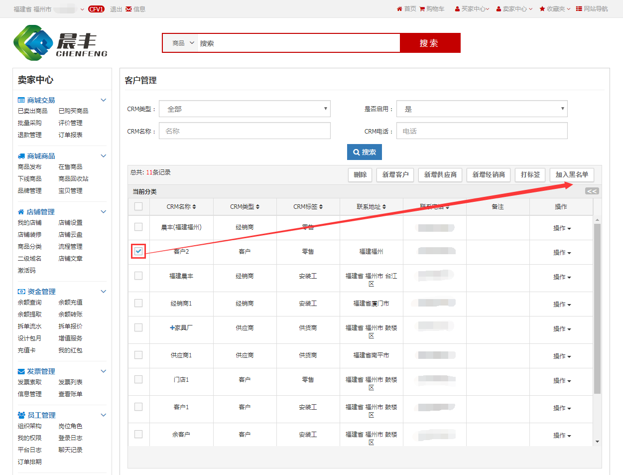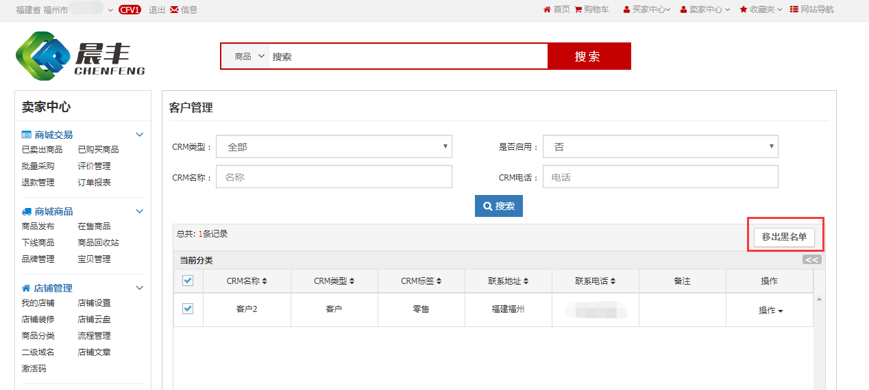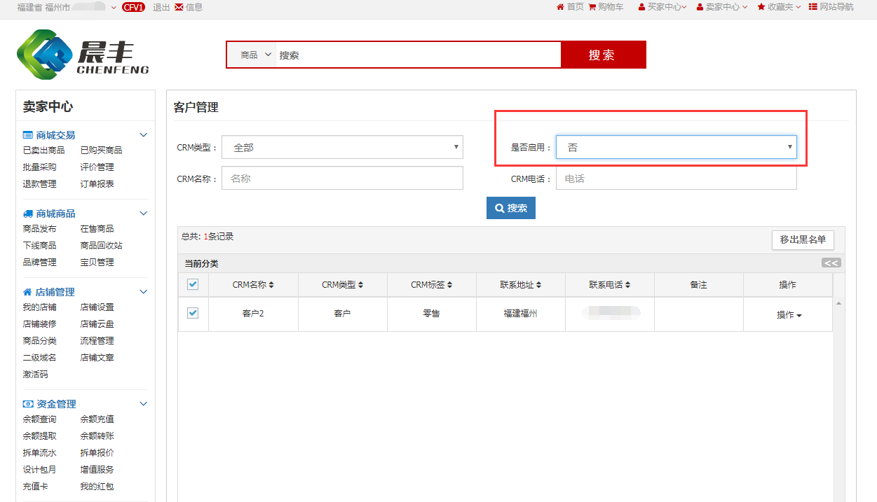 客户2被加入黑名单,我们可以通过将查询条件的是否启用改成否,查询被加入黑名单的客户