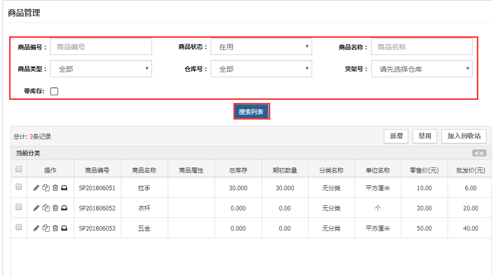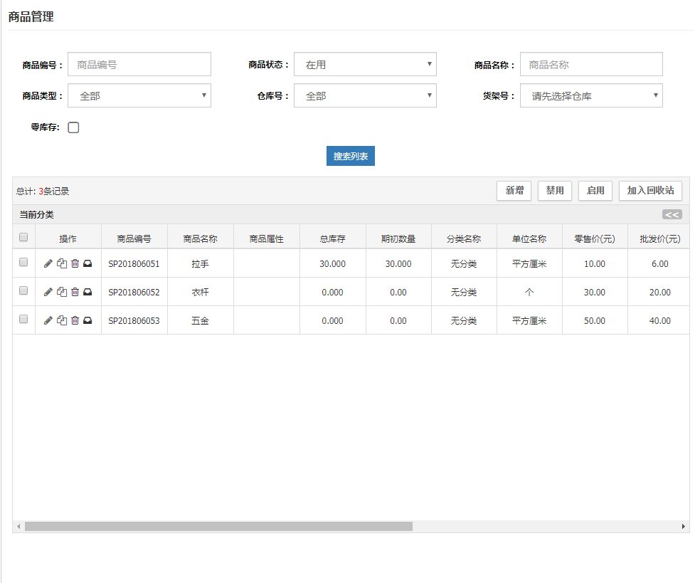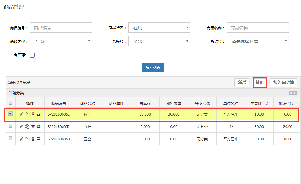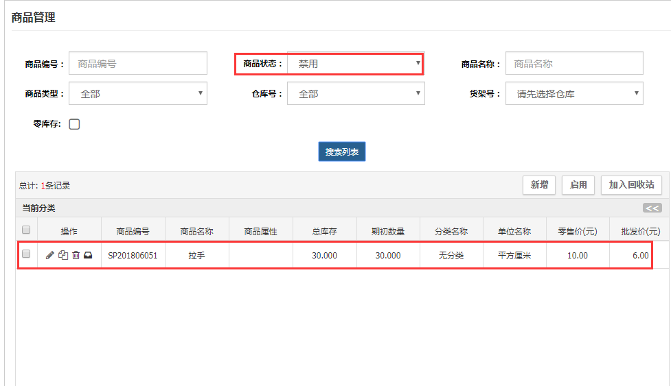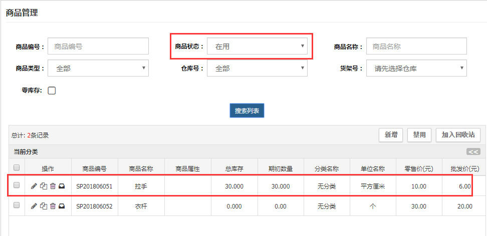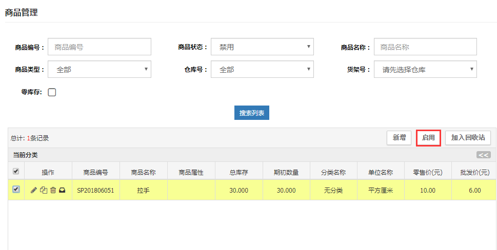 启用设置成功,商品状态改为在用;商品又可以正常使用