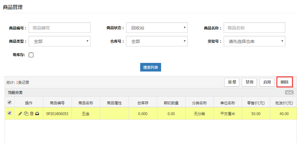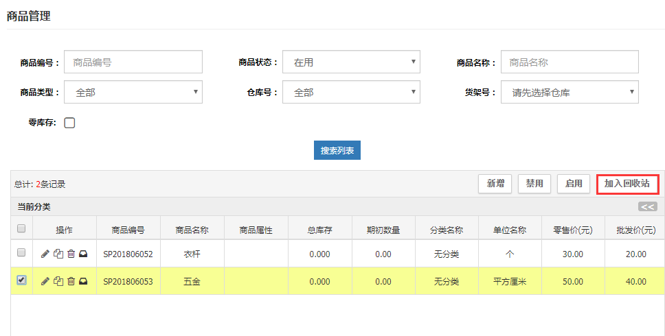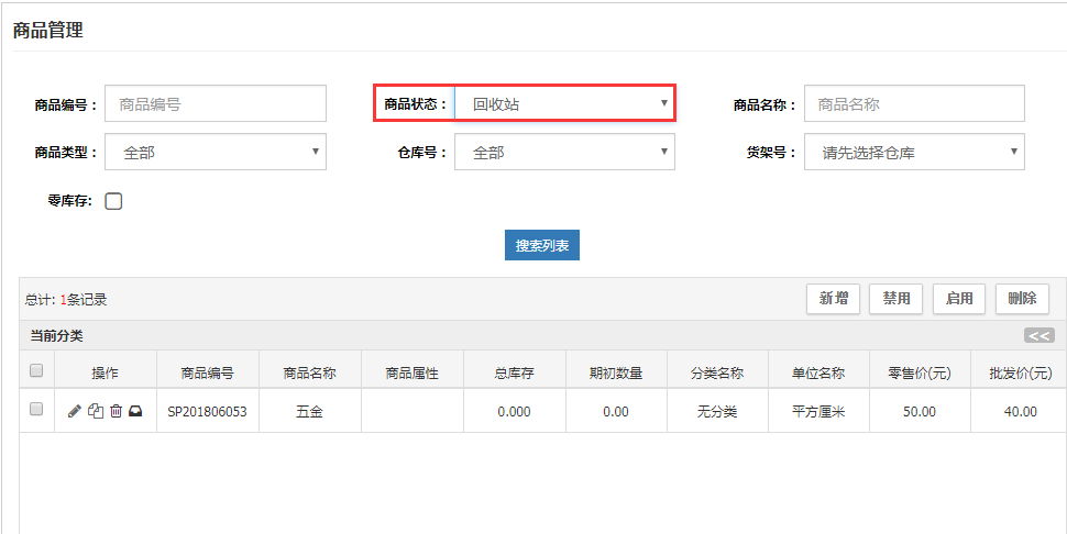用户可以选择禁用商品或者回收站商品,点击启用按钮