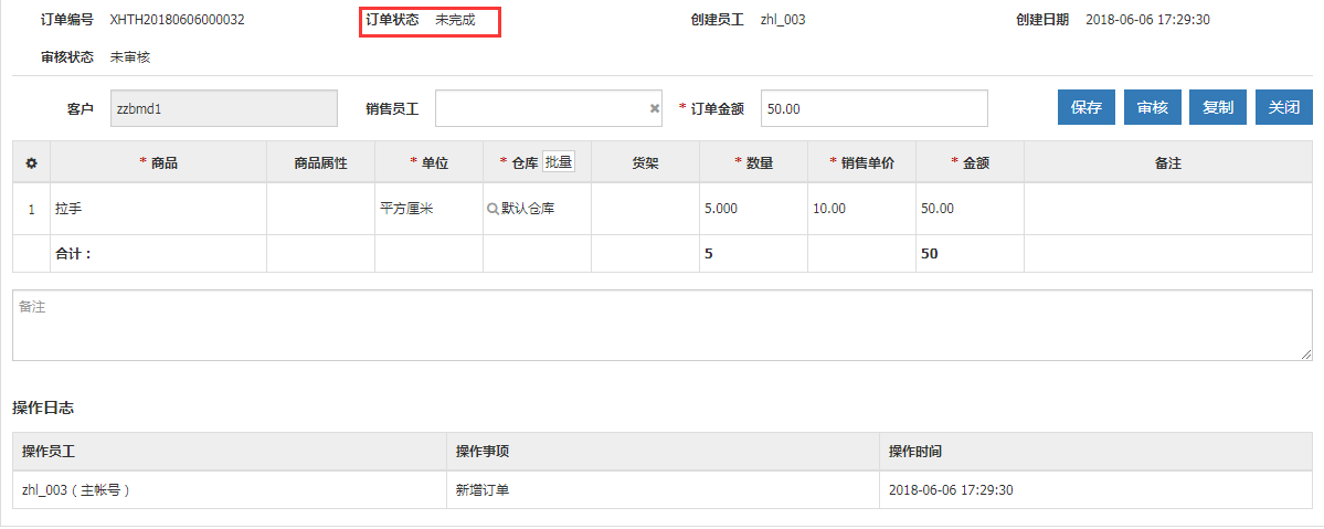 完善信息后,点击保存,订单新增成功,但状态为未完成
