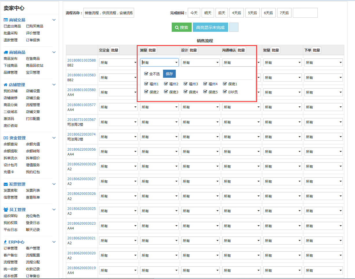 在流程分配页面,可对单个订单流程进行员工分配,也可对某个流程下的所有订单进行批量分配