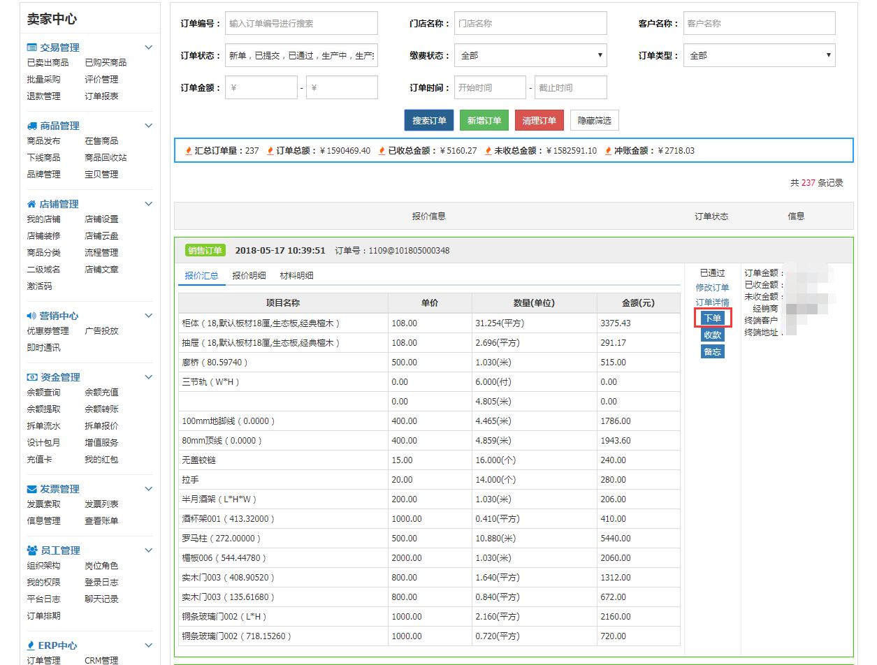 柜体订单一定要选板材,如果不选板材则为下空单给工厂,详细操作点击查看文档:下空单给柜体工厂