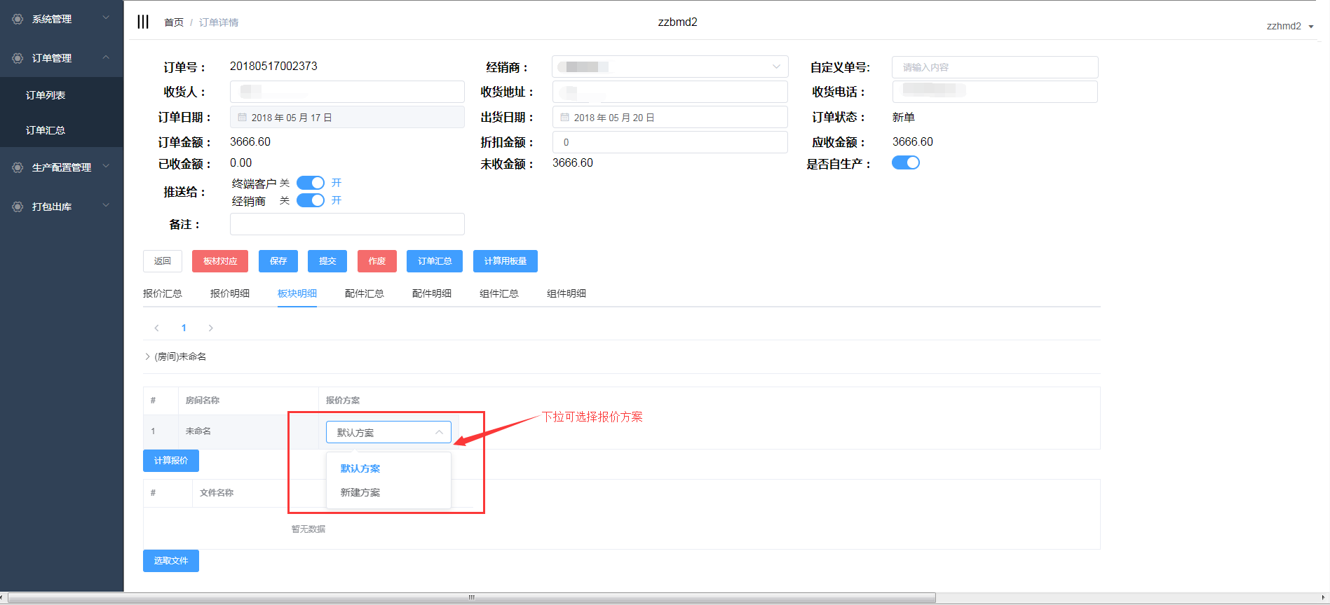 板材对应完成后,用户如果想要修改默认的报价方案,可选择其他的报价方案,系统户会自动计算报价