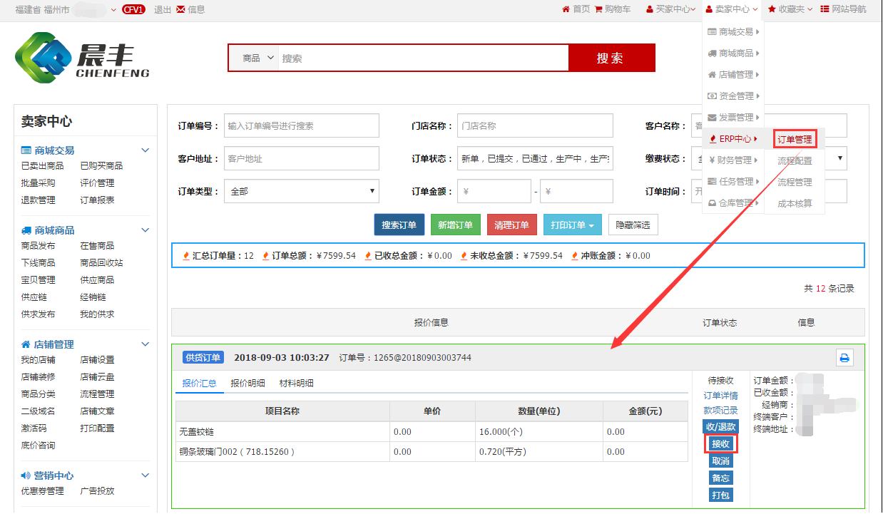 对于非柜体类型的子单,用户可在商城平台进入erp中心-订单管理找到该订单,点击接收