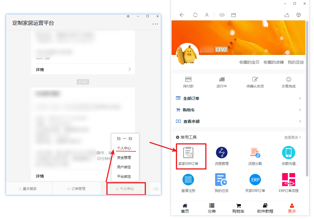 进入定制家居运营平台微信公众号,个人中心中的个人中心,即可进入手机端店铺界面;选择卖家ERP订单