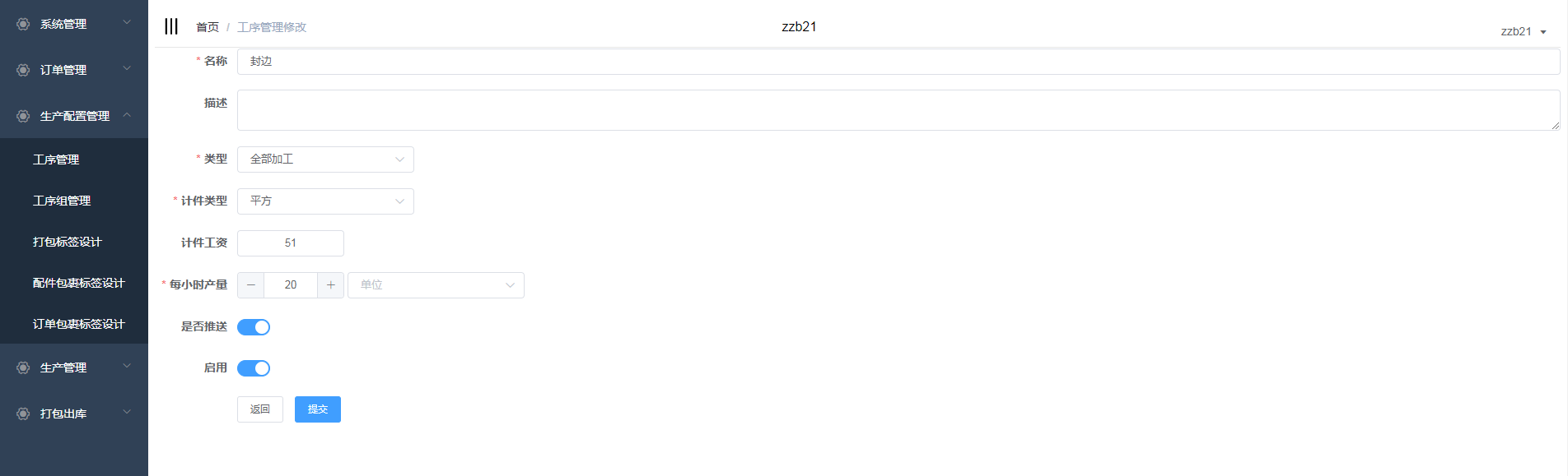 选择工序,点击编辑,在工序管理页面对工序进行编辑