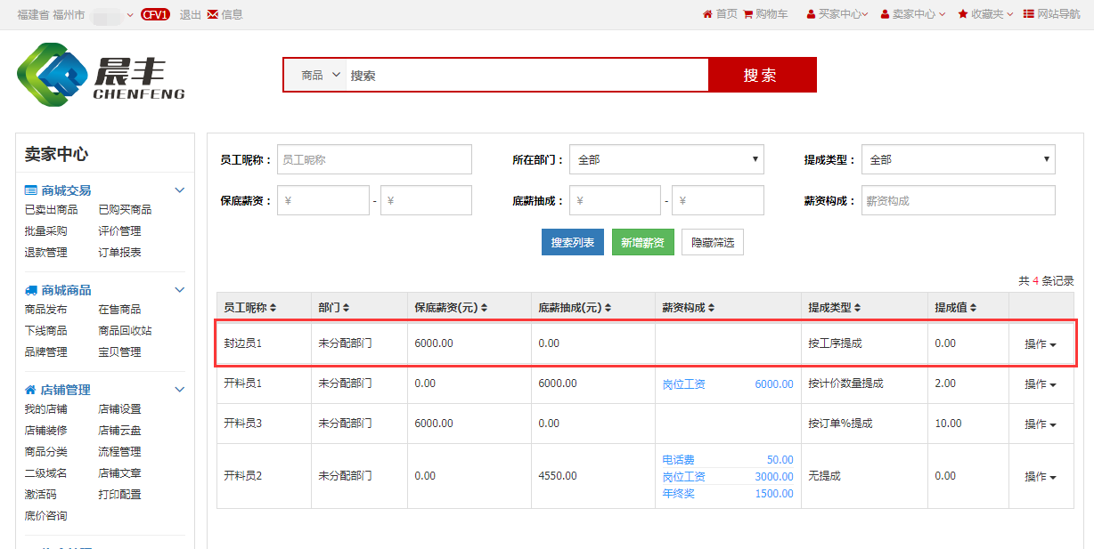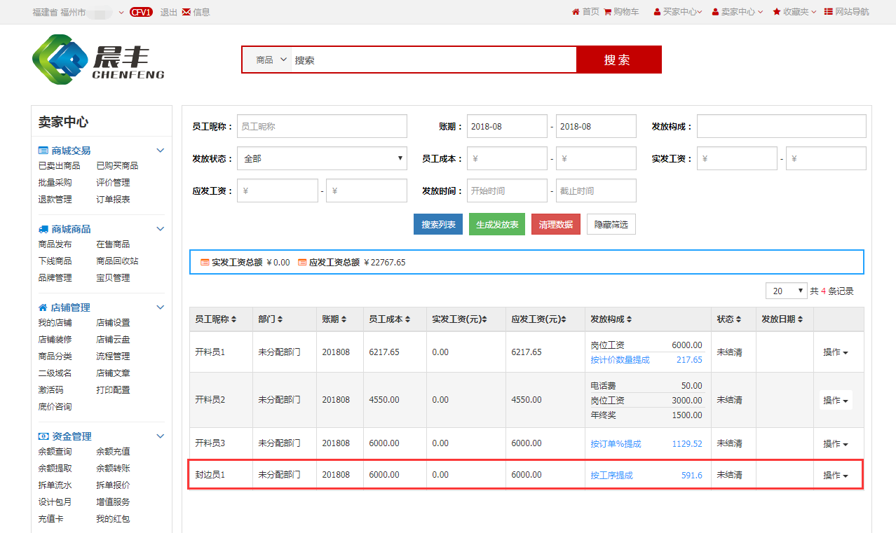 操作完订单的流程后,更新薪资发放中的薪资发放表,可看到封边员1的薪资构成中有提成