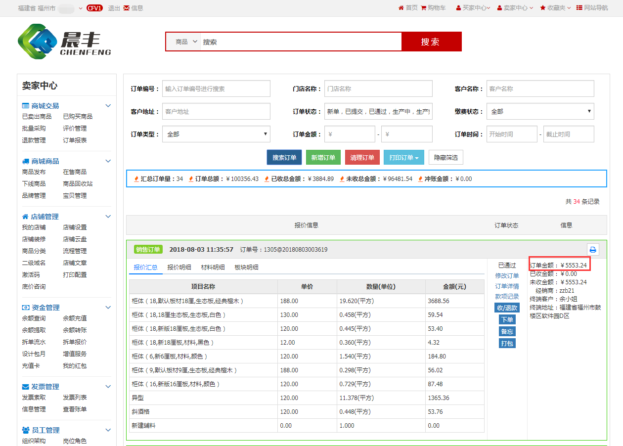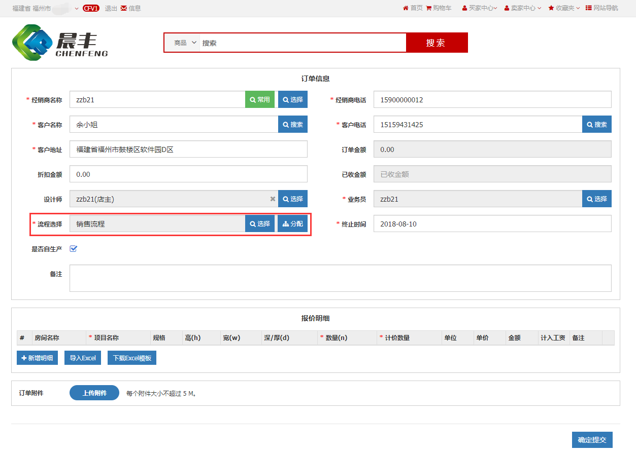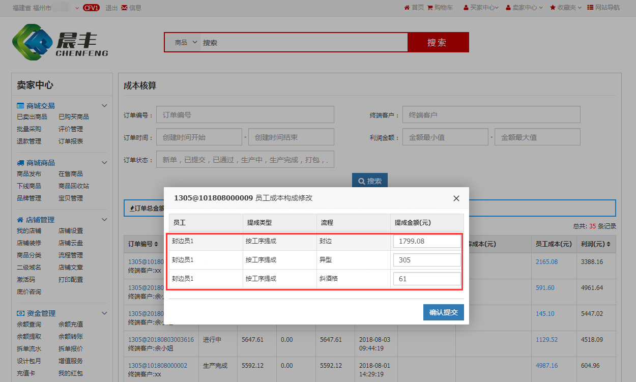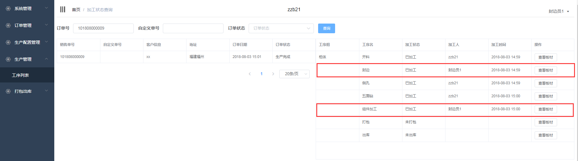 订单提交后,封边员1登录晨丰管理系统对该订单的封边和组件加工工序进行加工