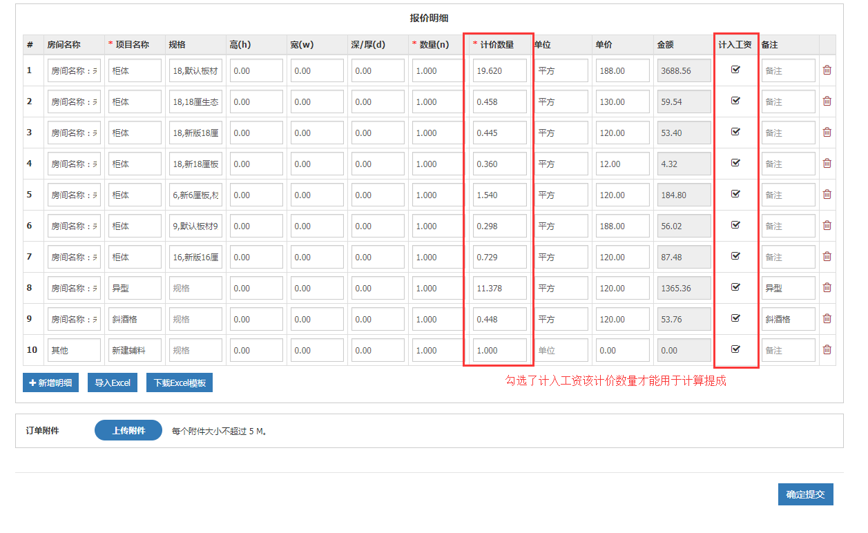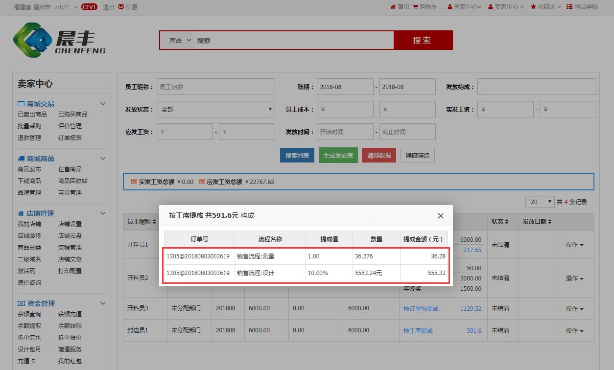明细中可查看到,封边员1完成的流程,测量的提成金额设置的为按金额:提成金额*计价数量=1*36.276=36.28;设计的提成金额设置为按订单%:订单金额*提成值=5553.24*10%=555.32