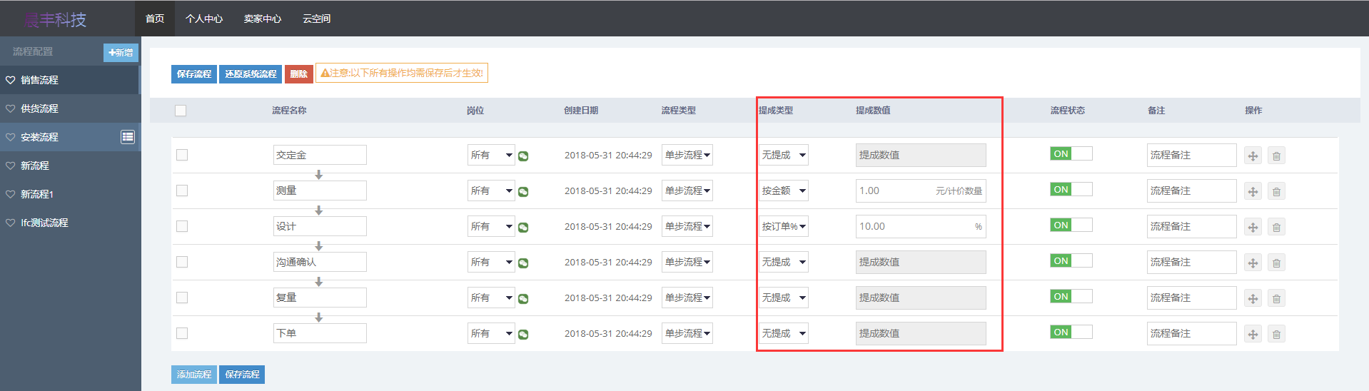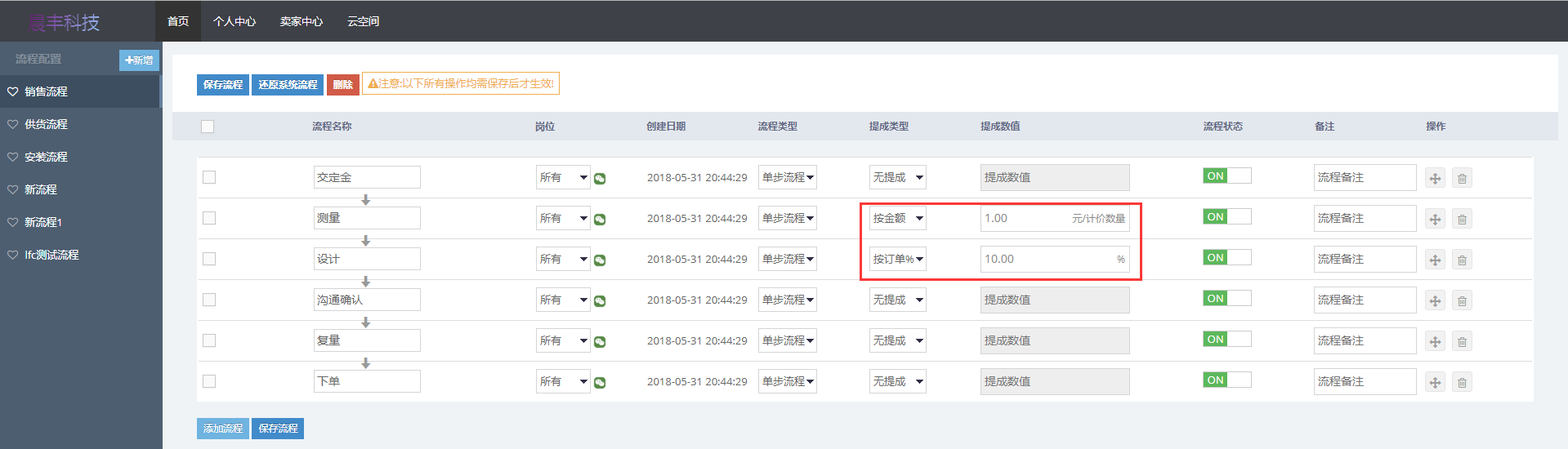 设置销售流程中子流程测量的提成类型为按金额提成,提成值为1元/计价数量;设计的提成类型为按订单%提成,提成值为10%,其他子流程无提成