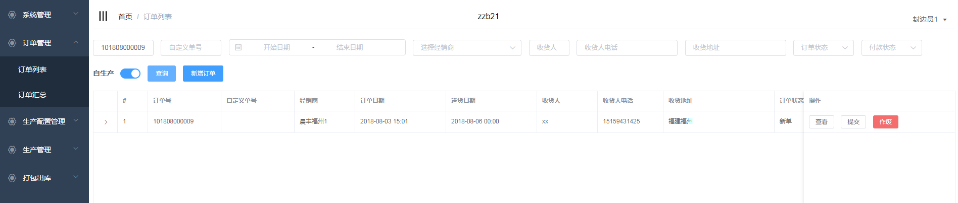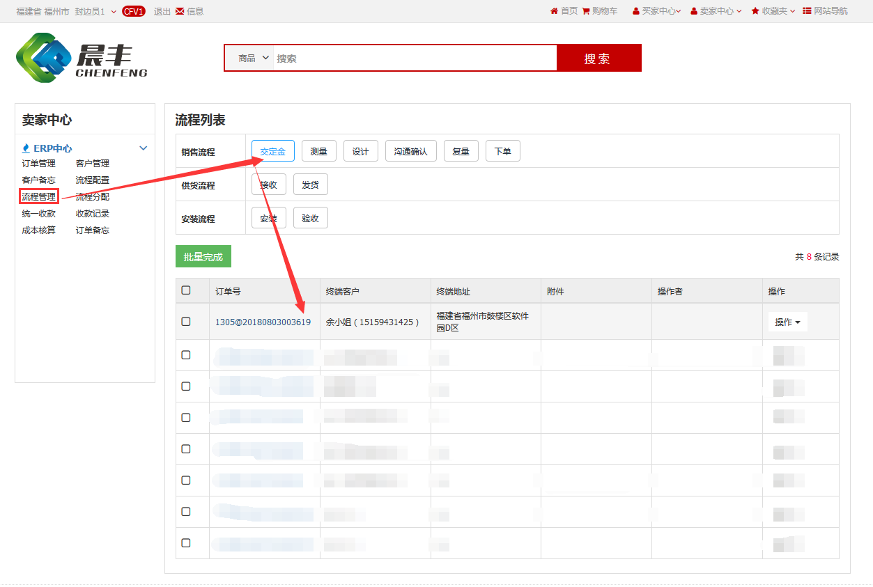 封边员1登录平台,在流程管理中对该订单进行流程操作