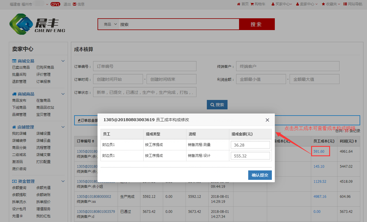 在erp中心-成本核算,也可查看该订单的员工成本(即员工对与该笔订单的提成值)
