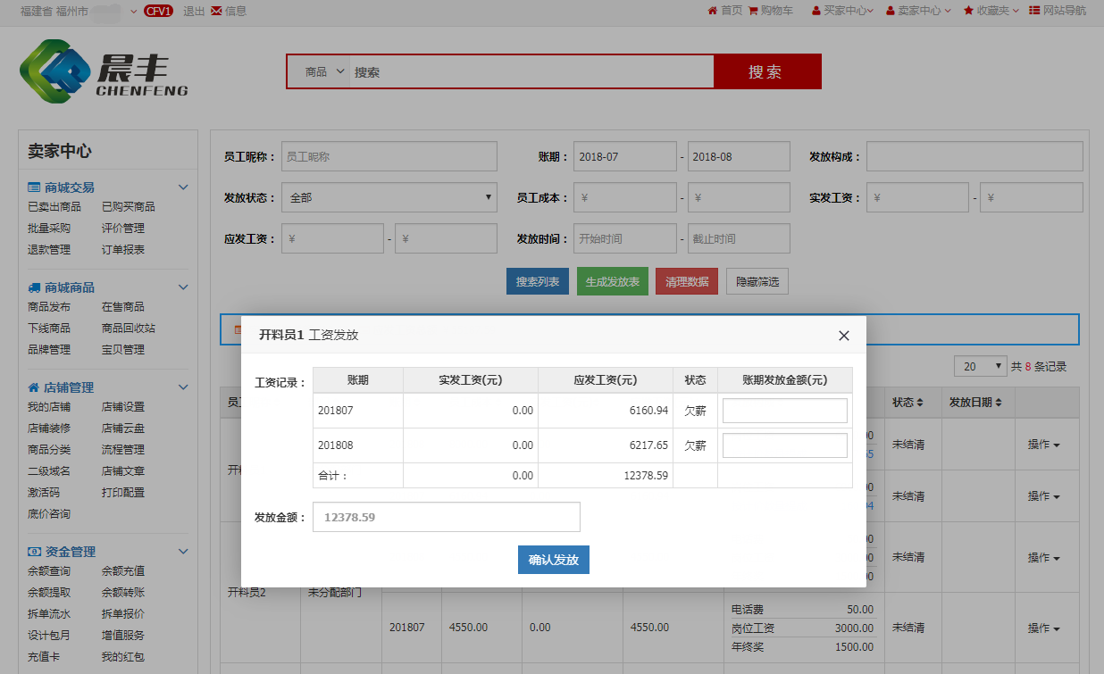 工资发放页面显示的是该员工所有未平衡的账期工资,可对不同账期进行发放金额